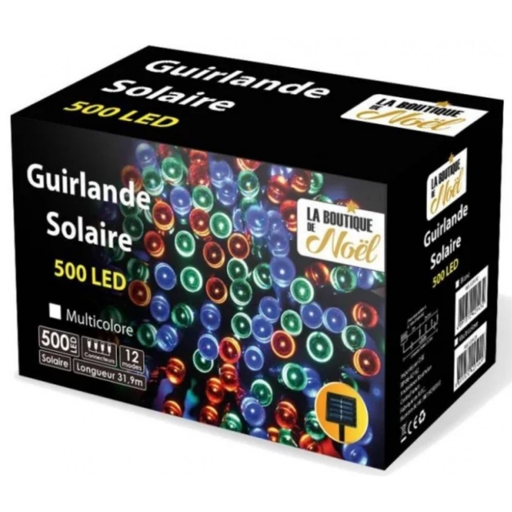 Guirlande solaire 500 led multicolore. Dimensions totales : l. 31,9 m. Entre 1ère et dernière led : l. 29,9 m. Entre chaque led : 6 cm. Poids : 620 g environ. Éclairage : 500 led. Couleur : multicolore.