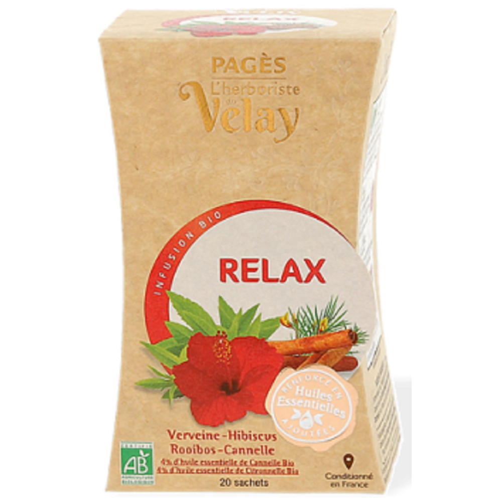 Infusion bio Relax Pagès faite à base d'un savoureux mélange de plantes mêlé à la Cannelle parfumée et légèrement relevée - Idéale pour accompagner une pause détente à tout moment de la journée - Formulée à base de verveine et d'hibiscus qui lui confèrent une saveur agréable et favorisent la relaxation. Ingrédients : Verveine feuilles bio 53%, Rooibos parties aériennes bio 17%, Cannelle écorces bio 10%, Huiles essentielles granulées de Cannelle bio et Citronnelle bio 8%, Hibiscus fleurs bio 7%, Honeybush parties aériennes bio.