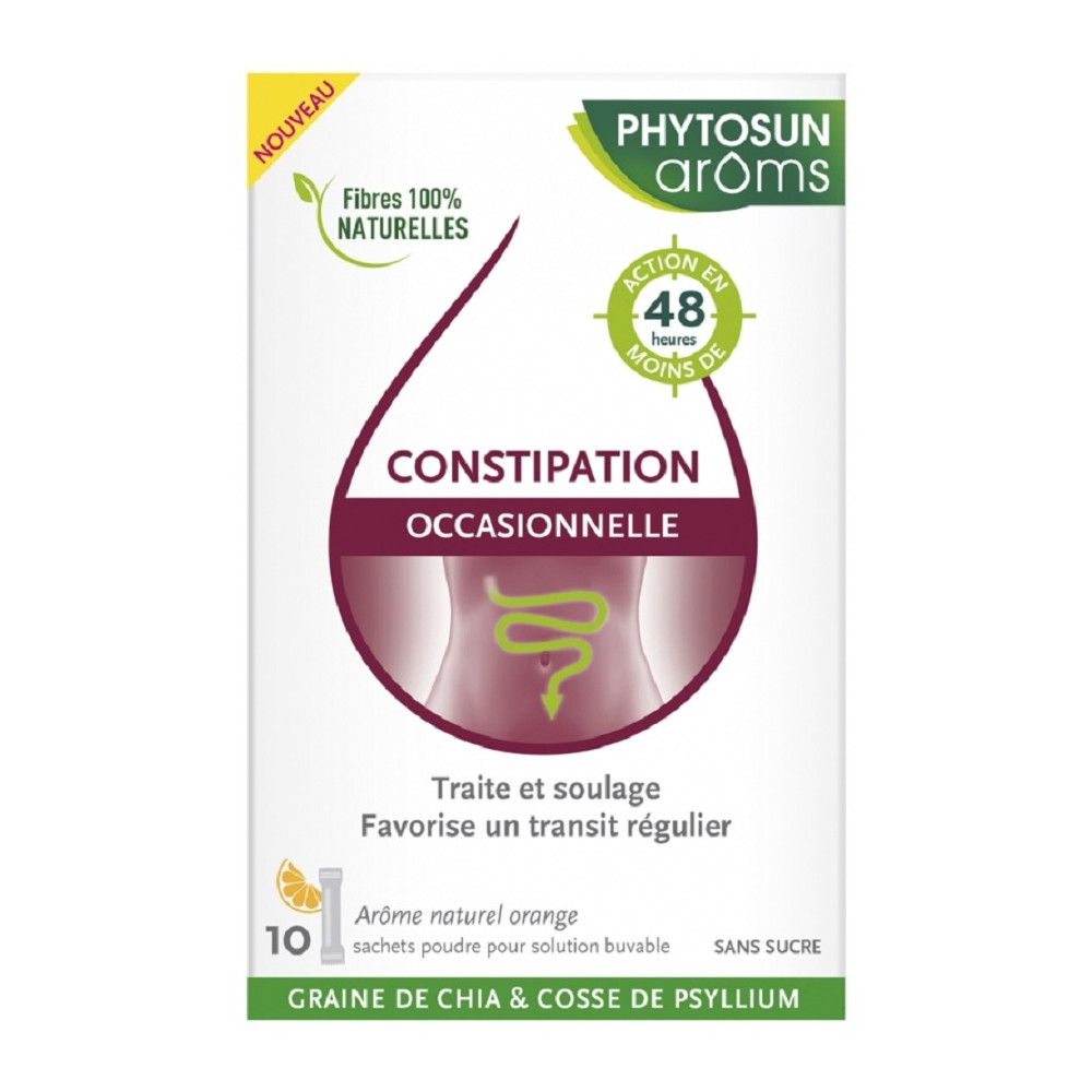 Phytosun Aroms constipation occasionnelle est un dispositif médical destiné aux personnes souffrant de constipation occasionnelle - Contiens une association de fibres 100% naturelles dérivées de la cosse de psyllium et de la graine de chia, deux ingrédients à l’efficacité scientifiquement prouvée - Permettent de restaurer un bon transit intestinal en cas de constipation occasionnelle.