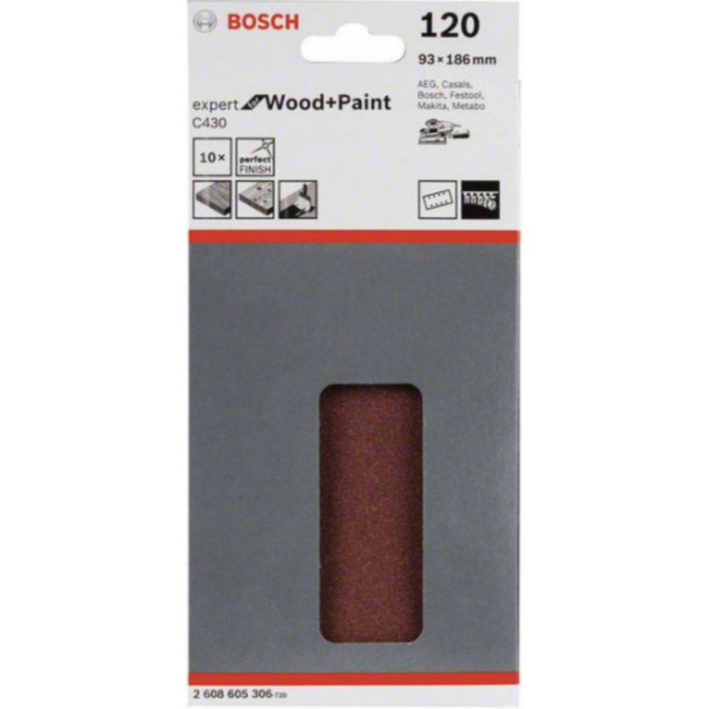 Lot de 10 feuilles abrasives Bosch C430 - Pour ponceuse vibrante (8 trous) - Dimensions : 93 × 186 mm - Grain 120 – idéal bois & peinture - Référence : 2608605306 - EAN : 3165140161237.