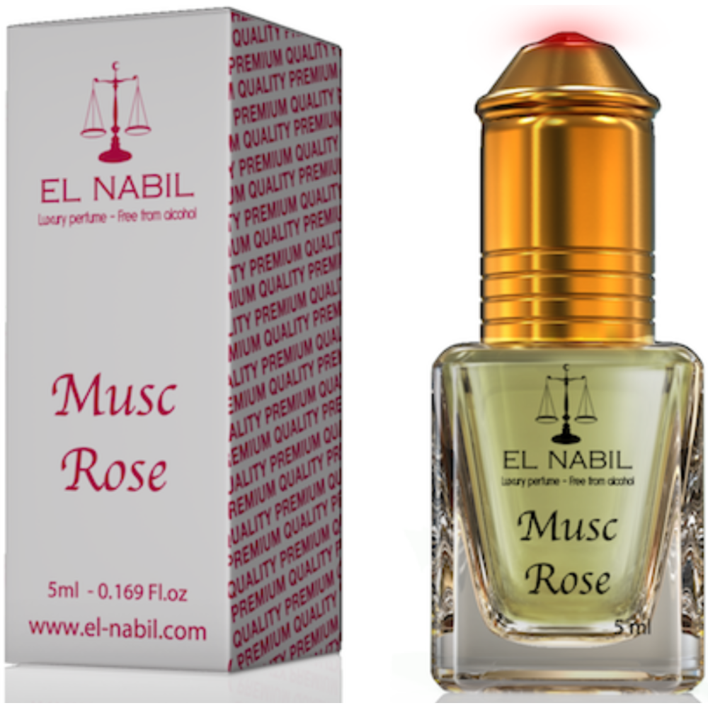 Parfum Musc rose El Nabil aux senteurs de l'orient sans alcool - de 5 ml de contenance - Parfum mixte à l'arôme fleuri - Présente une note de tête fraîche (mandarine), sur un cœur fleuri sensuel (rose, jasmin), qui s'épanouit sur un fond cèdre et vanille.