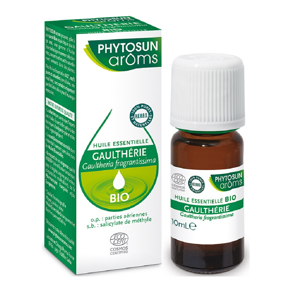 Huile essentielle gaulthérie bio Phytosun Arôms indiquée pour soulager les douleurs musculaires et les douleurs de règles - Formulée 100% pure et naturelle, non diluée et non modifiée - Certifiée à 100% agriculture biologique par Ecocert Greenlife selon le référentiel Cosmos - Possède des propriétés antalgique, vulnéraire, anti-inflammatoire, antirhumatismale, antibactérienne et antioxydante, antispasmodique et antitussive.