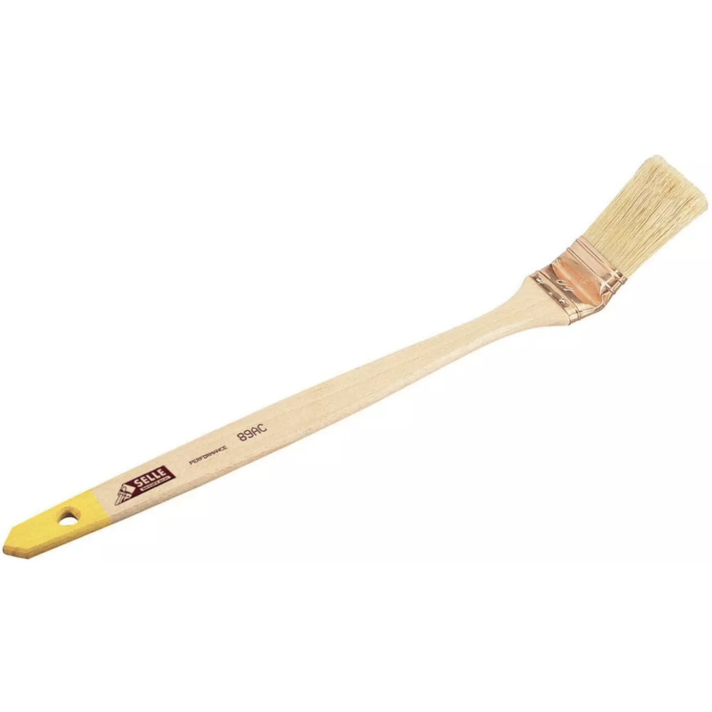 Brosse radiateur coudée sur plat Ocai - Référence : 89AC-25 - Gamme : Série ARTISAN N°25 - Mélange de soies naturelles et fibres synthétiques - Tirure normale pour une application standard - Virole en acier cuivré résistante - Manche en bois verni incolore avec extrémité jaune - Code EAN : 3341410714253.