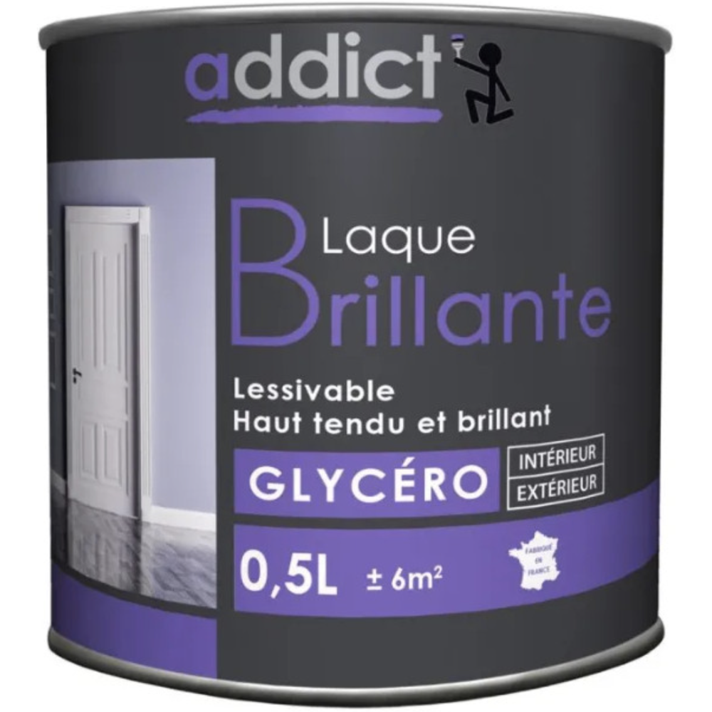 Peinture laque glycéro Addict noire brillante – Référence : ADD111357 - Contenance : 0,5 L - Usage : intérieur / extérieur - Supports : bois, métal, mobilier, huisseries (avec primaire) - Finition : Brillante, décorative et protectrice - Résistance : Intempéries et lessivage - Rendement : 10–12 m²/L - Application : Brosse ou rouleau - Séchage : 6 h au toucher - Nettoyage : White spirit - EAN : 3661521113579.