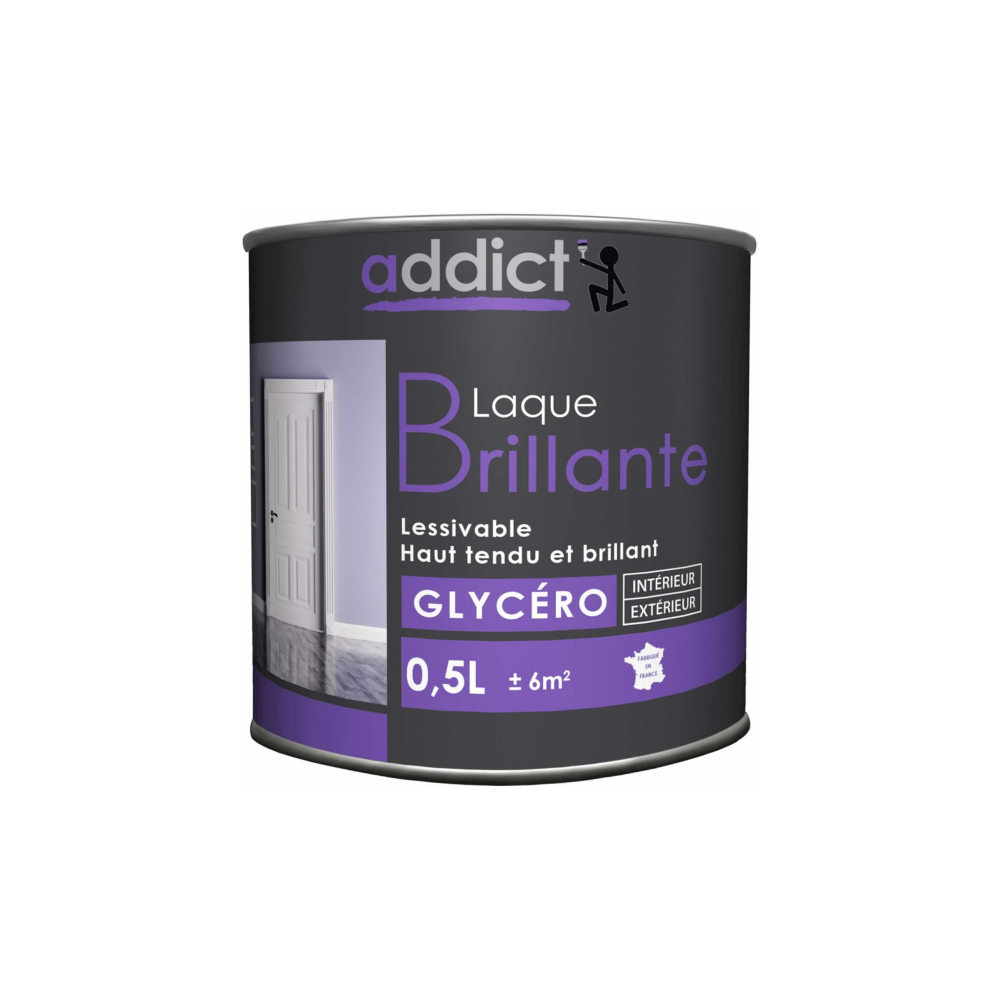Peinture laque glycéro Addict noire brillante – Référence : ADD111357 - Contenance : 0,5 L - Usage : intérieur / extérieur - Supports : bois, métal, mobilier, huisseries (avec primaire) - Finition : Brillante, décorative et protectrice - Résistance : Intempéries et lessivage - Rendement : 10–12 m²/L - Application : Brosse ou rouleau - Séchage : 6 h au toucher - Nettoyage : White spirit - EAN : 3661521113579.