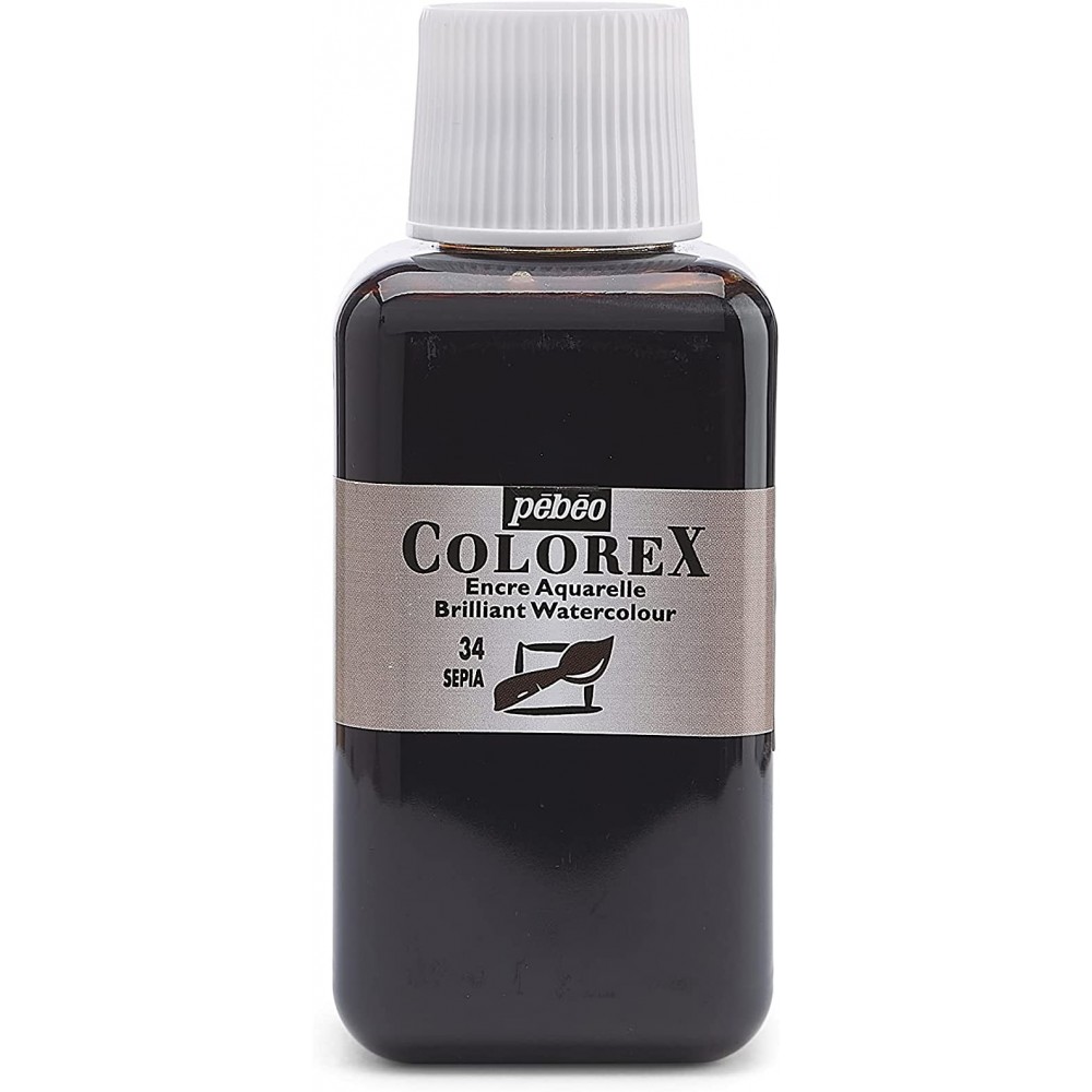 Sépia - Encre aquarelle Colorex 45ml Pébéo - C'est l'encre aquarelle préférée de tous les illustrateurs et dessinateurs professionnels qui la recherchent pour sa lumière, son rendu velouté et ses aplats parfaitement unis. Grâce à la vivacité de ses 60 couleurs et à son étonnante concentration, l'encre Colorex s'est imposée comme la référence mondiale des écoles d'art.
