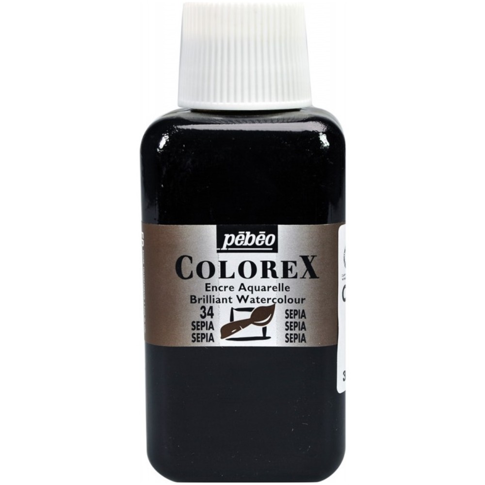 Sépia - Encre aquarelle Colorex 45ml Pébéo - C'est l'encre aquarelle préférée de tous les illustrateurs et dessinateurs professionnels qui la recherchent pour sa lumière, son rendu velouté et ses aplats parfaitement unis. Grâce à la vivacité de ses 60 couleurs et à son étonnante concentration, l'encre Colorex s'est imposée comme la référence mondiale des écoles d'art.