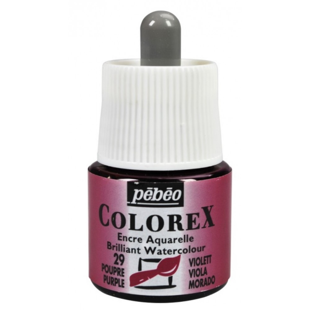 Pourpre - Encre aquarelle Colorex 45ml Pébéo - C'est l'encre aquarelle préférée de tous les illustrateurs et dessinateurs professionnels qui la recherchent pour sa lumière, son rendu velouté et ses aplats parfaitement unis. Grâce à la vivacité de ses 60 couleurs et à son étonnante concentration, l'encre Colorex s'est imposée comme la référence mondiale des écoles d'art.