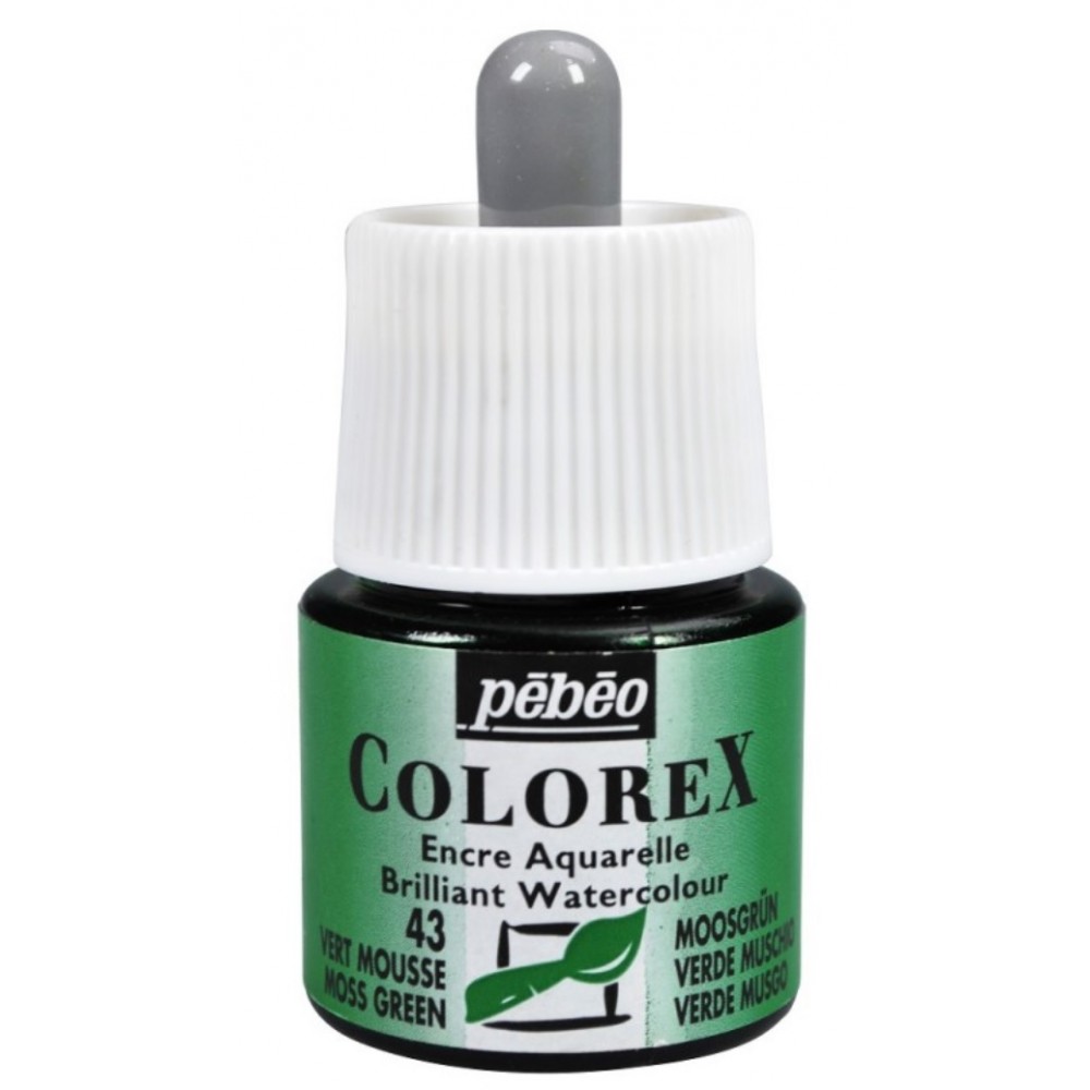 Vert mousse - Encre aquarelle Colorex 45ml Pébéo - C'est l'encre aquarelle préférée de tous les illustrateurs et dessinateurs professionnels qui la recherchent pour sa lumière, son rendu velouté et ses aplats parfaitement unis. Grâce à la vivacité de ses 60 couleurs et à son étonnante concentration, l'encre Colorex s'est imposée comme la référence mondiale des écoles d'art.