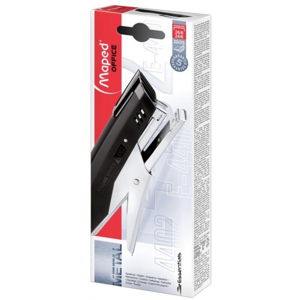 Maped Pince agrafeuse Essentials E4400, noir, capacité d'agrafage: 15 feuilles, profondeur de gorge: 44 mm100% en métal, mécanisme de chargement par le haut, type d'agrafage: fermé, ôte-agrafes intégré, avec trou d'accrochage, pour agrafes No. 10.