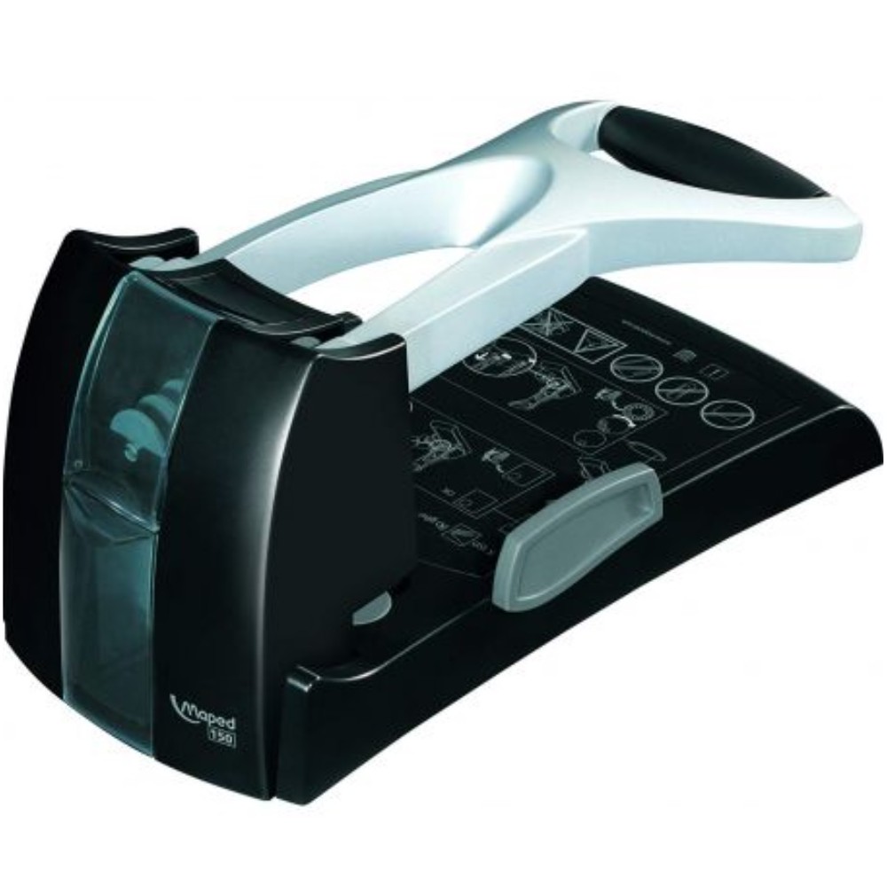 Maped Perforateur d'archives Expert HD150, noir/argent capacité de perforation: 150-180 feuilles, perforation: 80 mm, réglette de guidage, bac pour pièces de rechange, trappe pour le vidange des résidus de perforation, fourni avec 4 rondelles de rechange, poignée rotative soft.