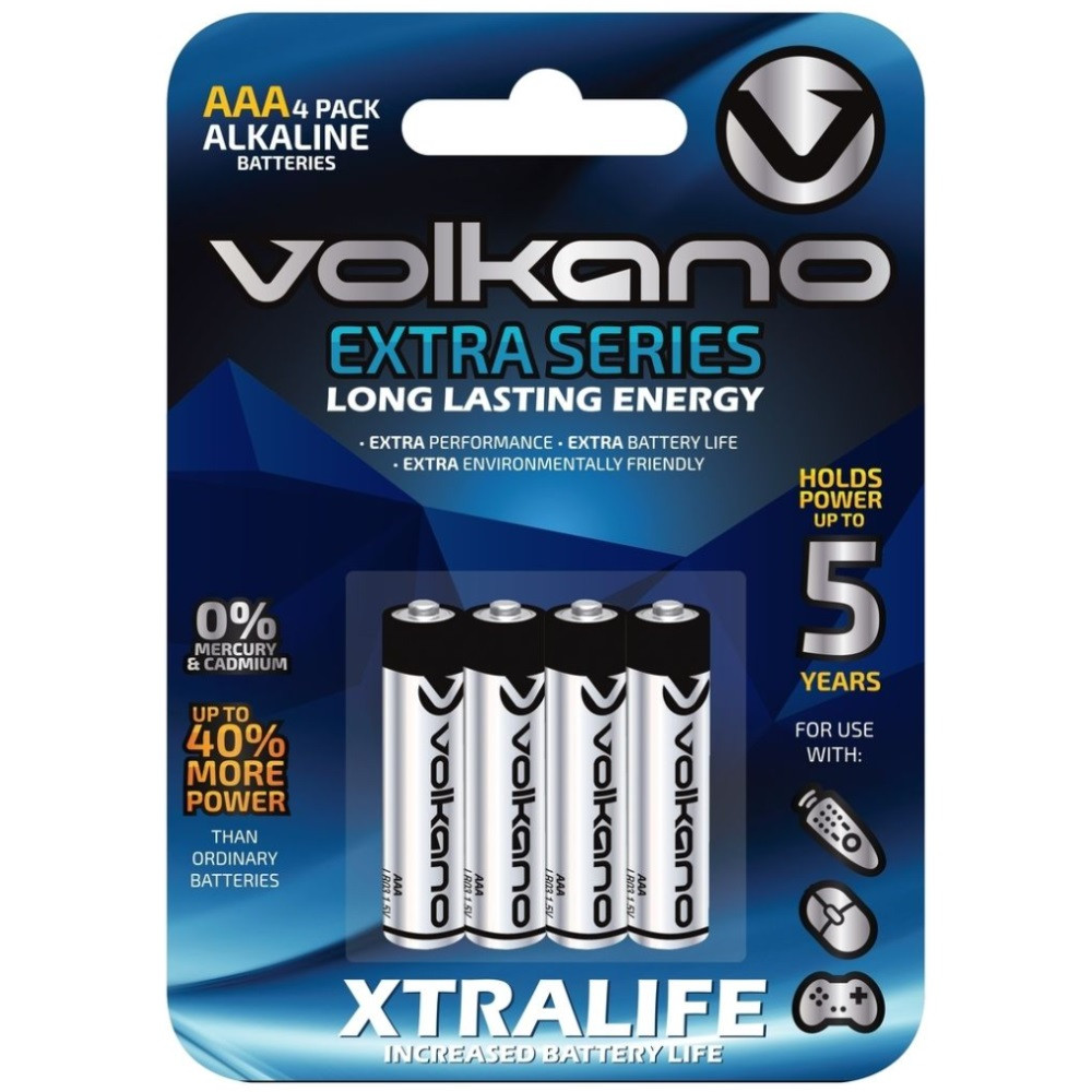 Blister de 4 piles AA Volkano Extra Series composé de piles alcalines et écologiques qui fournissent une énergie durable, soit 2.5 fois plus longtemps que d’autres - Convient pour une utilisation diverse pour les télécommandes, contrôleurs et autres dispositifs à piles - Conditionné dans un emballage inviolable - Dimensions du blister : 2 cm de haut, 11 cm de long et 7 cm de large pour un poids de 120 grammes.