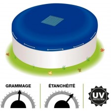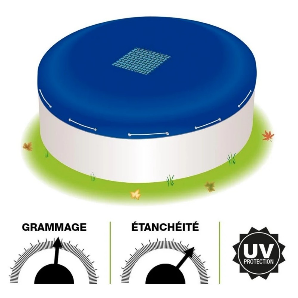 Protégez l'eau de votre bassin des végétaux et insectes indésirables grâce à cette couverture de piscine en polyéthylène tressé de 140 g/m². Cet accessoire de piscine permet également de maintenir la température de l'eau lors de journées orageuses ou de nuits plus fraîches que d'ordinaire. Gardez une eau claire et propre ! En complément des produits de traitement d'eau la bâche de protection retardera la formation des algues. La bâche est équipée d'un filet d'écoulement en son centre, ainsi les eaux pluviales, en se déversant dans votre bassin, entraîneront avec elles les brindilles et insectes qui seront facilement récupérables.