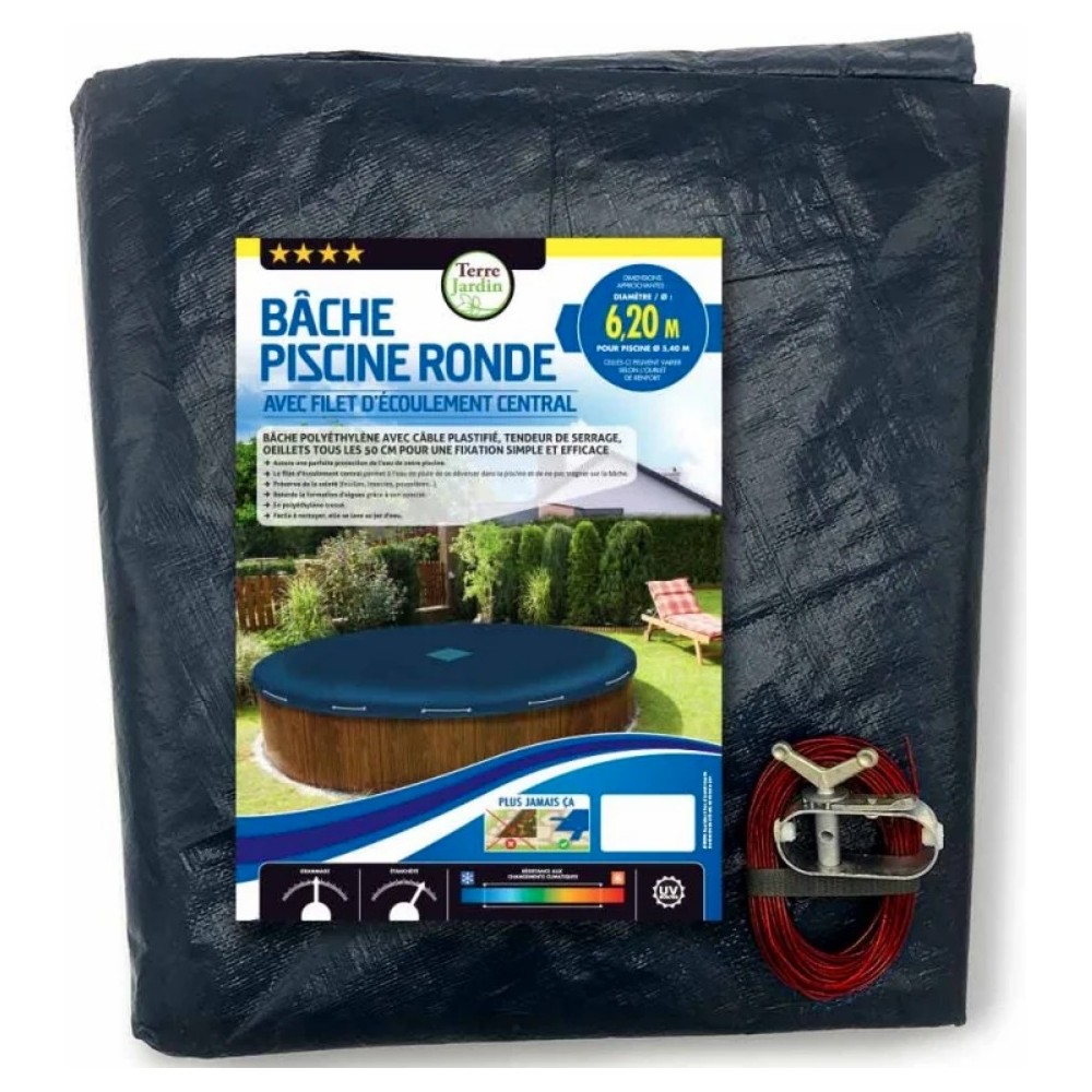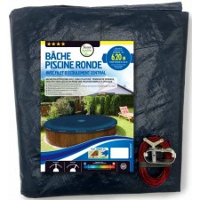 Bâche piscine ronde 6,20 m. 140 g/m². Dimensions : Ø 6,2 m. Flet d’écoulement : l. 35 x l. 35 cm. Matière : polypropylène. Poids : 4,7 kg environ. Coloris : bleu. Grammage / qualité : 120 g / m² pour piscine de Ø 5,4 m. Livrée avec sangle de maintien et tendeur. Traitée anti-UV.