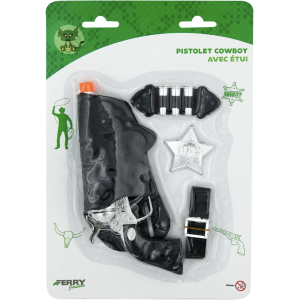 Pistolet Cowboy avec étui FERRY - Type : Jouet - Livré avec étui - Inclus : étoile de shérif - 3 balles fournies - À partir de : 3 ans - Avertissements : Attention ! Ne convient pas aux enfants de moins de 36 mois. Petits éléments. Danger d’étouffement. Longue corde. Danger de strangulation. Ne pas utiliser près des oreilles. Une mauvaise utilisation peut provoquer des problèmes auditifs - EAN : 3286413022328.