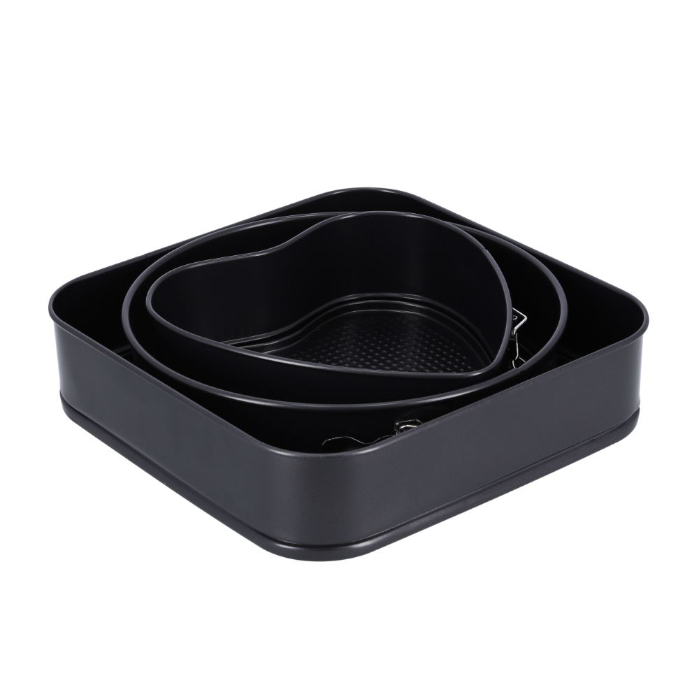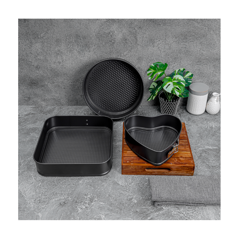 Lot de 3 moules à charnière ronds, en forme de cœur et carrés ROYALFORD RF9902 - L'ensemble comprend : 1 moule à charnière rond 26 x 6,8 cm, 1 moule à charnière en forme de cœur 24 x 24 x 6,8 cm, 1 moule à charnière carré 28 x 28 x 6,8 cm - Surface antiadhésive pour un démoulage facile et un nettoyage rapide - S'utilise en toute sécurité au four, au lave-vaisselle, au réfrigérateur et au congélateur - La construction résistante à la décoloration résiste aux taches, facilitant ainsi le nettoyage.