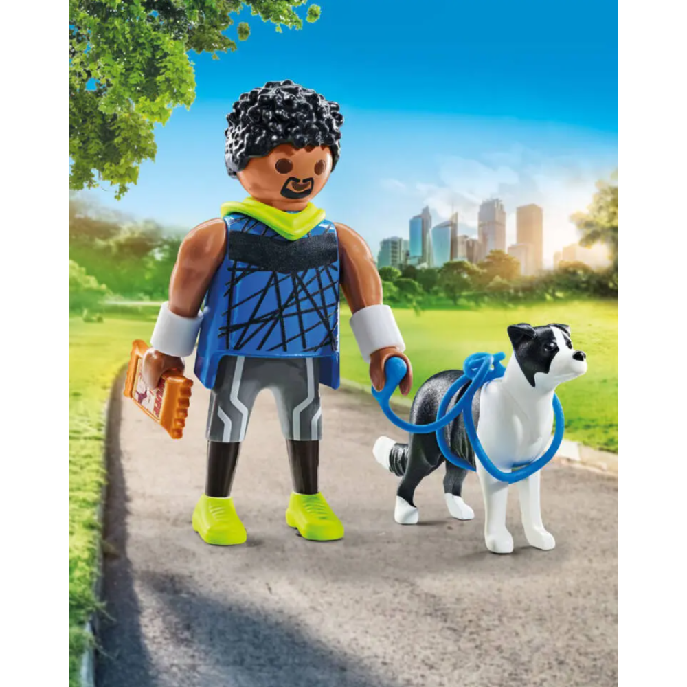 Jeu Playmobil composé de 2 figurines représentant un homme sportif et son chien Border Collie - Indiqué pour stimuler la créativité et l’imagination des enfants - Fourni avec divers accessoires pour une expérience de jeu intéressante : 1 friandise et 1 laisse avec harnais pour chien - Fait 100 grammes pour 12 cm de long, 9 cm de large et 3 cm de profondeur - Convient parfaitement pour les jeunes enfants âgés de 3 ans et plus.