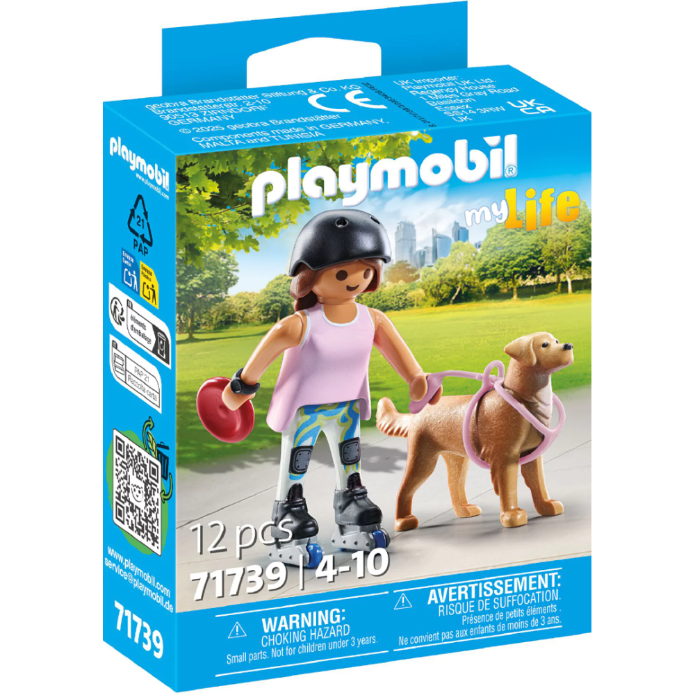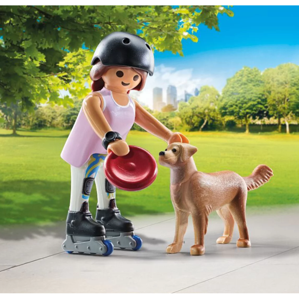 Figurines Playmobil représentant une jeune fille rolleuse et son retriever proposées pour faire travailler l’imagination des jeunes enfants de 4 ans et plus - Fournie avec divers accessoires comme 1 casque, 1 frisbee, 1 laisse avec harnais pour chien, 1 montre-bracelet - Le retriever peut bouger la tête de haut en bas - Les rollers, le casque et la montre sont amovibles - Le frisbee peut être tenu dans la main du personnage - Aident à développer les compétences sociales et la créativité des jeunes esprits.