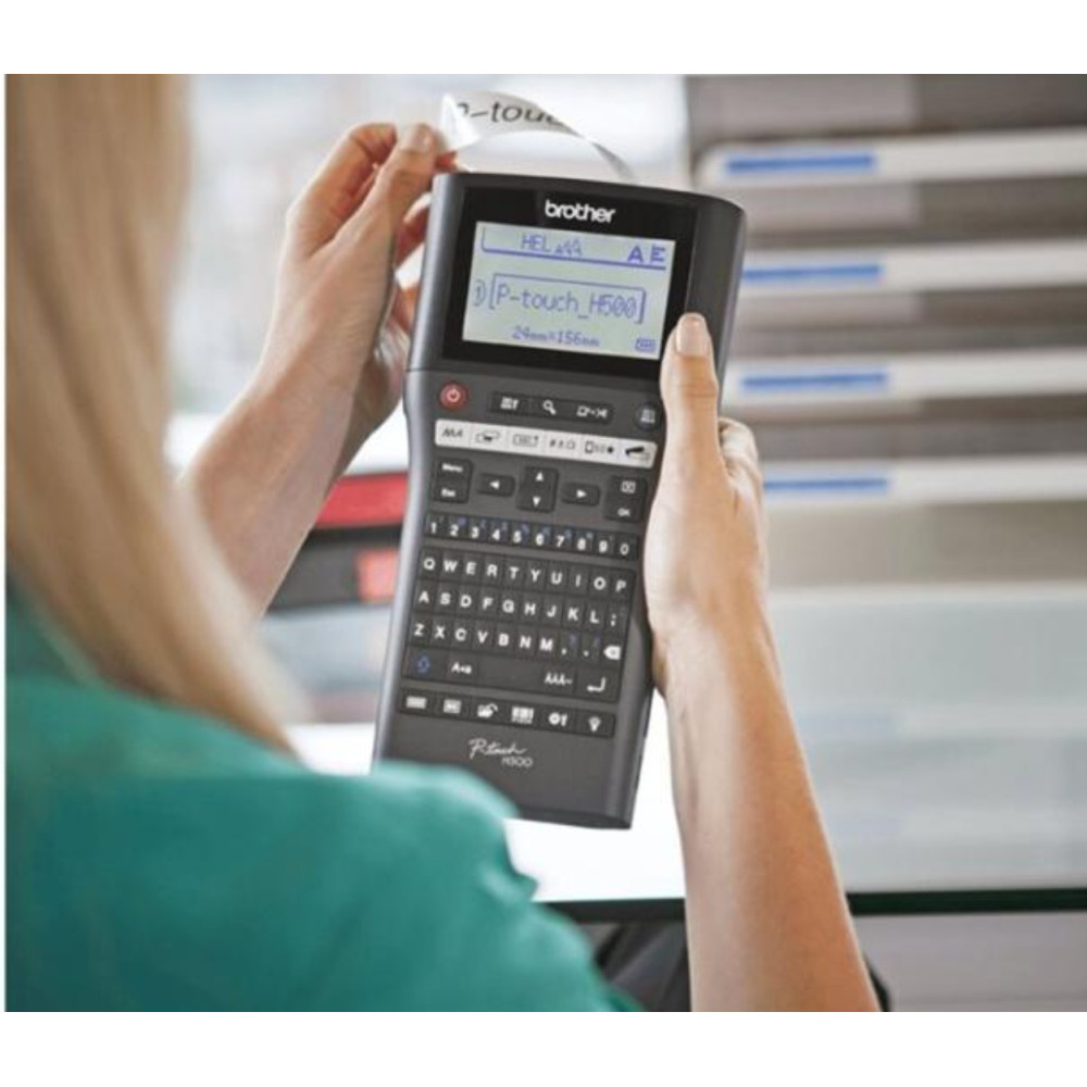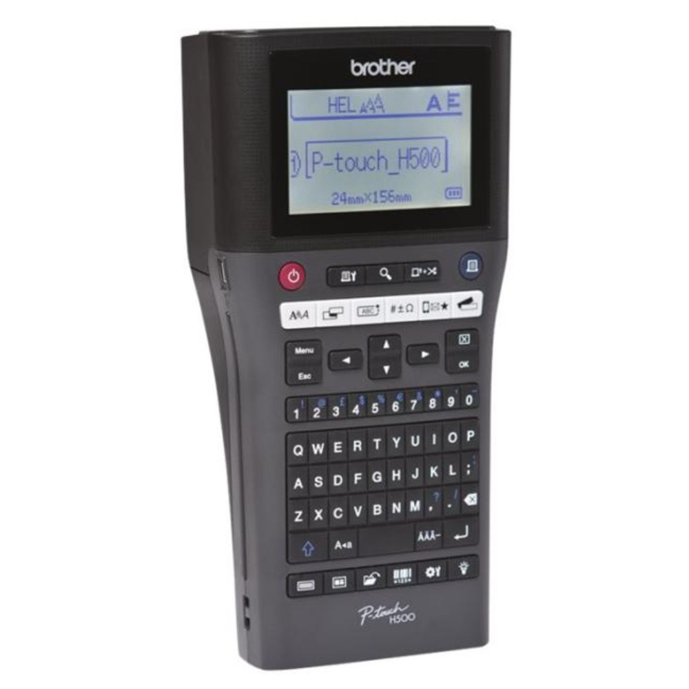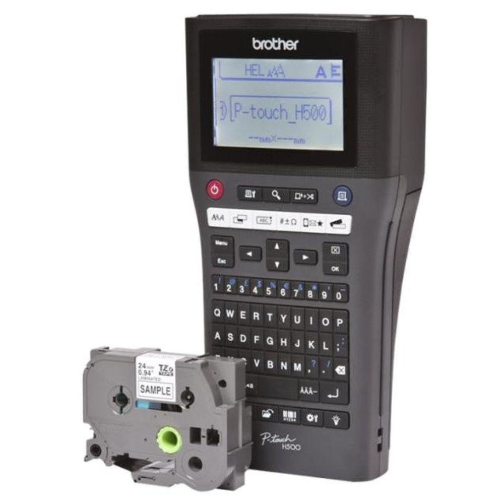 Brother P-Touch PT-H500 - Étiqueteuse - Noir et blanc - transfert thermique - Rouleau (2,4 cm) - 180 dpi - jusqu'à 20 mm/sec - USB 2.0 - outil de coupe - impression par 7 lignes. Description du produit. Grâce à son clavier aux touches souples, la PT-H500 vous permettra d'éditer des étiquettes durables pour l'identification de vos classeurs, archives, matériels informatiques ou fournitures de bureau. Caractéristiques techniques du produit. Imprime jusqu'à 24 mm de largeur. Vitesse d'impression de 20 mm/sec.Écran LCD retro-éclairé de 16 caractères x 3 lignes.Tailles de rubans : TZe 3,5 / 6 / 9 / 12 / 18 / 24 mm. Étiqueteuse portable & connectivité USB. Inclus : 1 ruban TZe 24 mm Noir/Blanc, un câble USB et CD logiciel