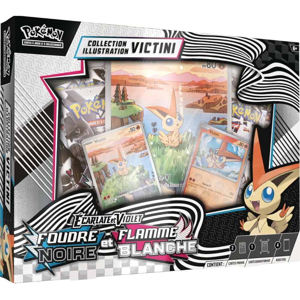 Pokemon coffret IR 4 boosters foudre noir et flamme blanche pour les 6ans et plus - Jeu de cartes à collectionner qui réunit le plaisir et les personnages du monde des pokémons dans un jeu de société captivant - Offre une carte promo brillante au style illustration rare et une carte brillante parallèle premium de Victini, ainsi qu'une carte grand format pour votre collection - Contient 2 boosters Ecarlate et violet foudre noir, 2 boosters Ecarlate et violet flamme blanche et 1 carte à code.