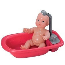 Coffret avec un poupon de 31 cm, au corps dur qui boit et fait pipi. Il porte un peignoir et un bandeau. Avec accessoires : une baignoire avec douche, 4 flacons factices (un shampoing, un savon pour le corps, une lotion et une crème), un biberon, un pot et une tétine. La douche fonctionne réellement : appuie sur le bouton (le robinet) pour voir de l'eau s'écouler. A partir de 3 ans.