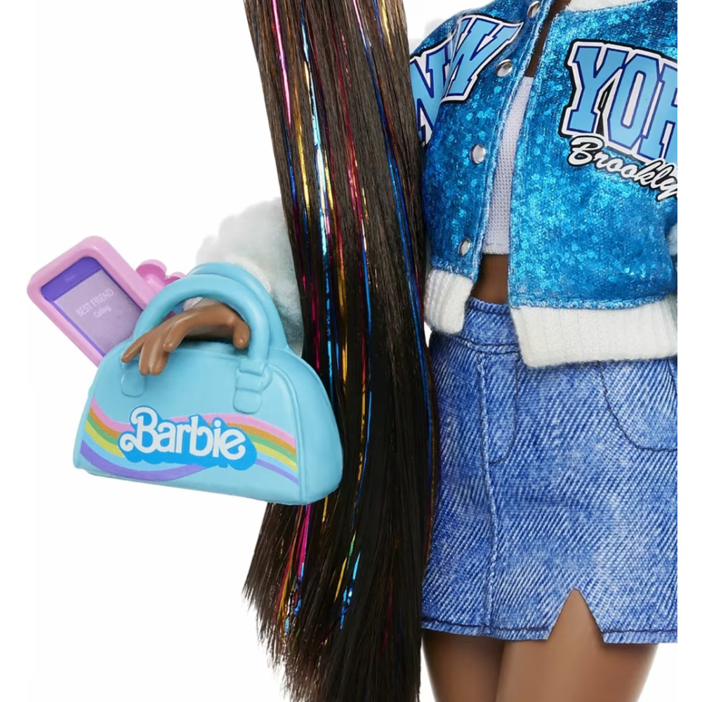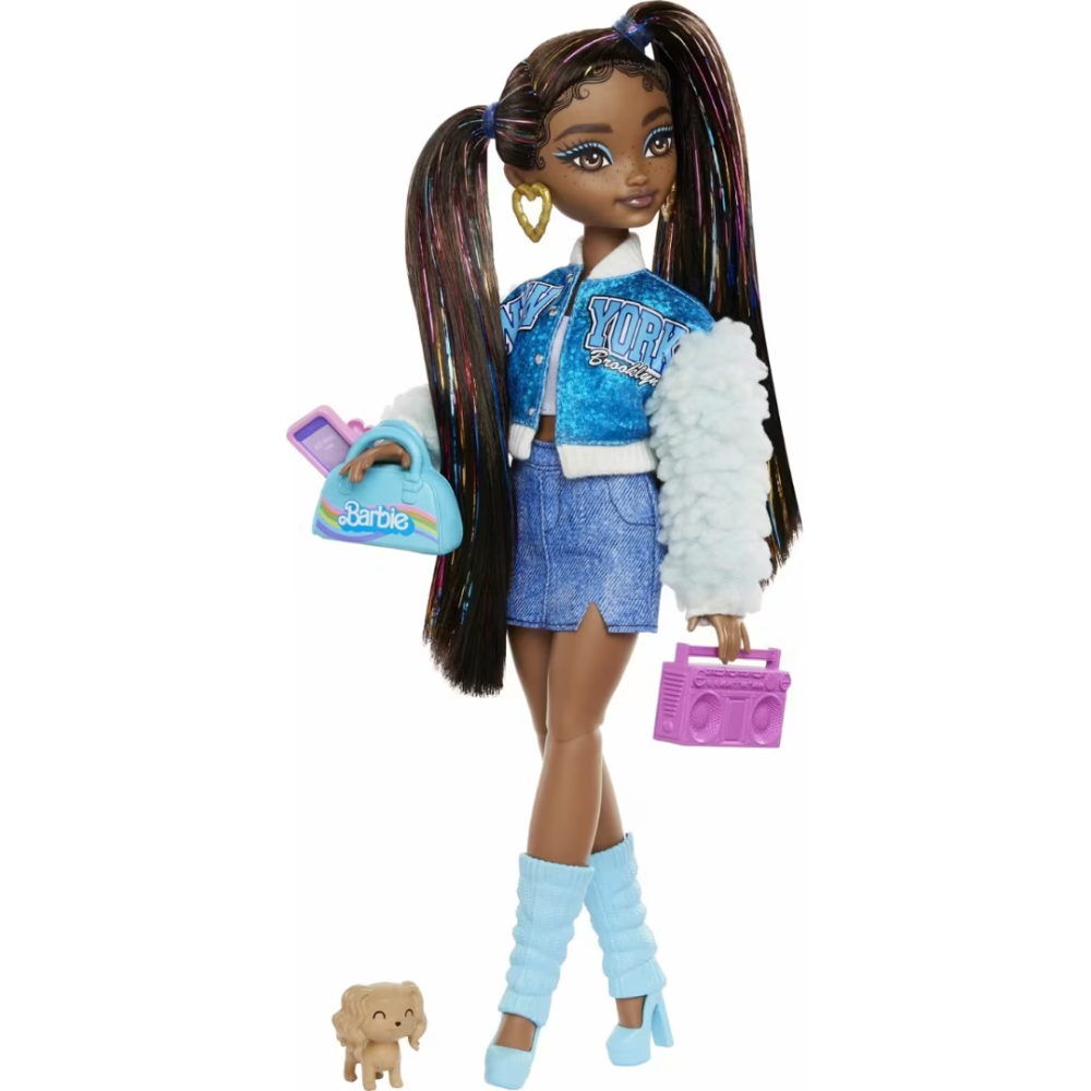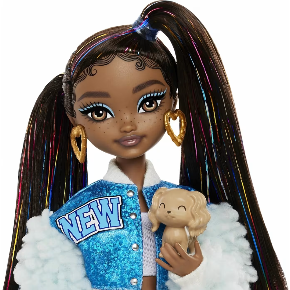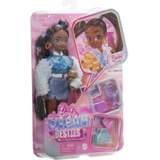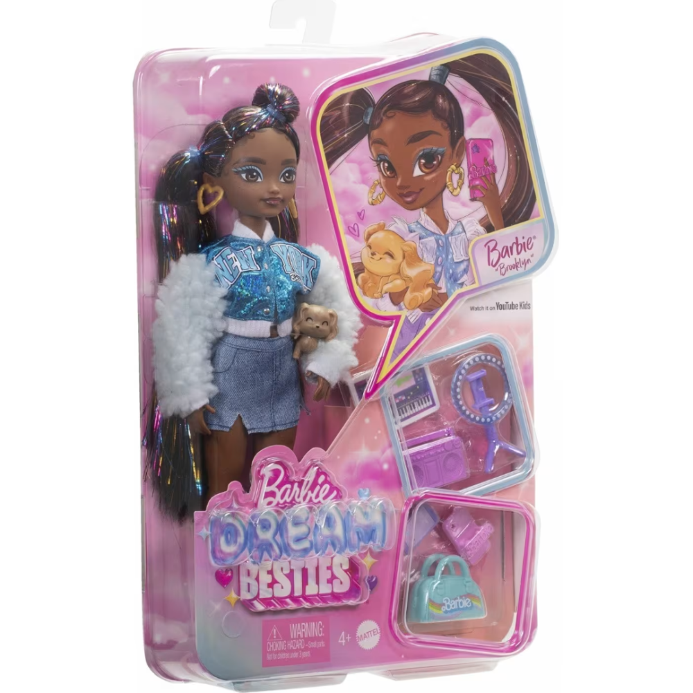 Poupée Barbie Dream Besties Barbie « Brooklyn » mesurant 12,7 pouces de haut - Fournie avec des accessoires comme boombox, tablette, lumière annulaire, sac de sport, téléphone avec étui et un adorable chiot, Pumpkin - Dotée d’un corps articulé et porte des vêtements amovibles comme sa veste varsity scintillante, sa jupe en jean, ses jambières et ses talons - Arbore de longs cheveux noirs, coiffés en plusieurs queues de cheval, avec des mèches brillantes tout au long de la personnalité qui mettent en valeur la personnalité créative du personnage - Fabriquée avec un mélange de polyester et plastique pour tenir dans le temps - Idéale pour inspirer les fillettes de 4 ans et plus, à réaliser leurs rêves.