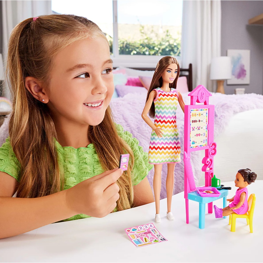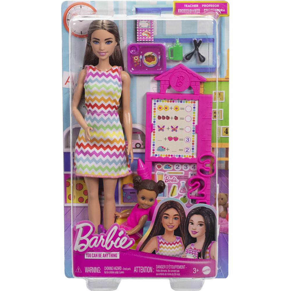 Poupée Barbie jouant le rôle d’une maîtresse qui enseigne - Idéale pour familiariser les enfants au métier noble de l’enseignement tout en stimulant ses capacités de raisonnement et de compréhension - Convient comme cadeau à offrir pour les enfants de 3 ans et plus - Accompagnée d’une figurine d’élève assise sur un siège et écoutant attentivement les leçons - Fournie avec un tableau haut présentant des notions d’apprentissage basique sur les nombres - Aide à stimuler l’imagination des tout-petits avec divers accessoires de classe comme les ciseaux de sécurité, un sac à dos et une chaise - Recommandée pour préparer les enfants prêts à être scolarisés à l’environnement d’une salle de classe.