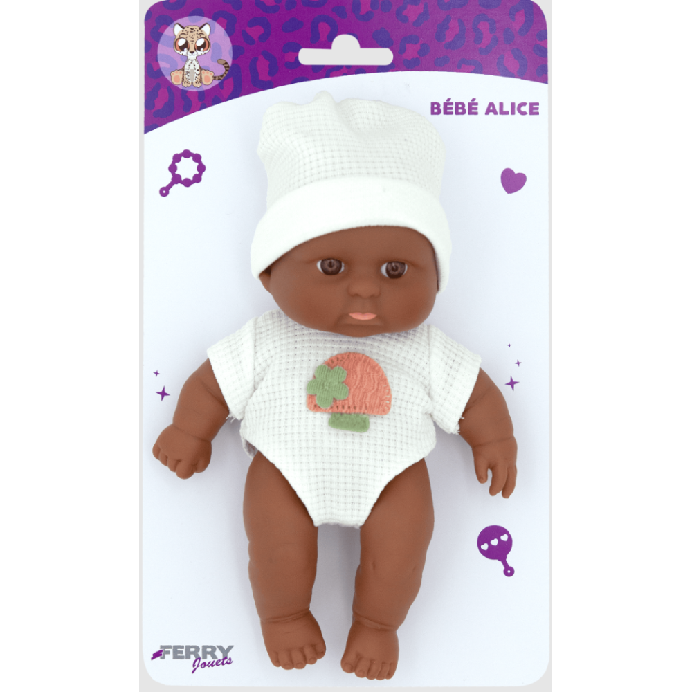 Bébé Alice en forme de poupée indiqué pour préparer les enfants à accueillir leur jeune frère ou sœur - Présente un corps doux et dodu avec un visage attendrissant pour susciter chez les enfants l’envie de le prendre dans les bras - Mesure 15 cm de long, 7 cm de large et 25 cm de haut pour un poids de 127 grammes - Peut être emporté facilement dans un sac à dos lors des déplacements - Proposé en 2 modèles assortis : 1 avec une bouche ouverte et 1 avec une bouche fermée, pour inciter l’enfant à imaginer divers scénarios avec ce poupon.