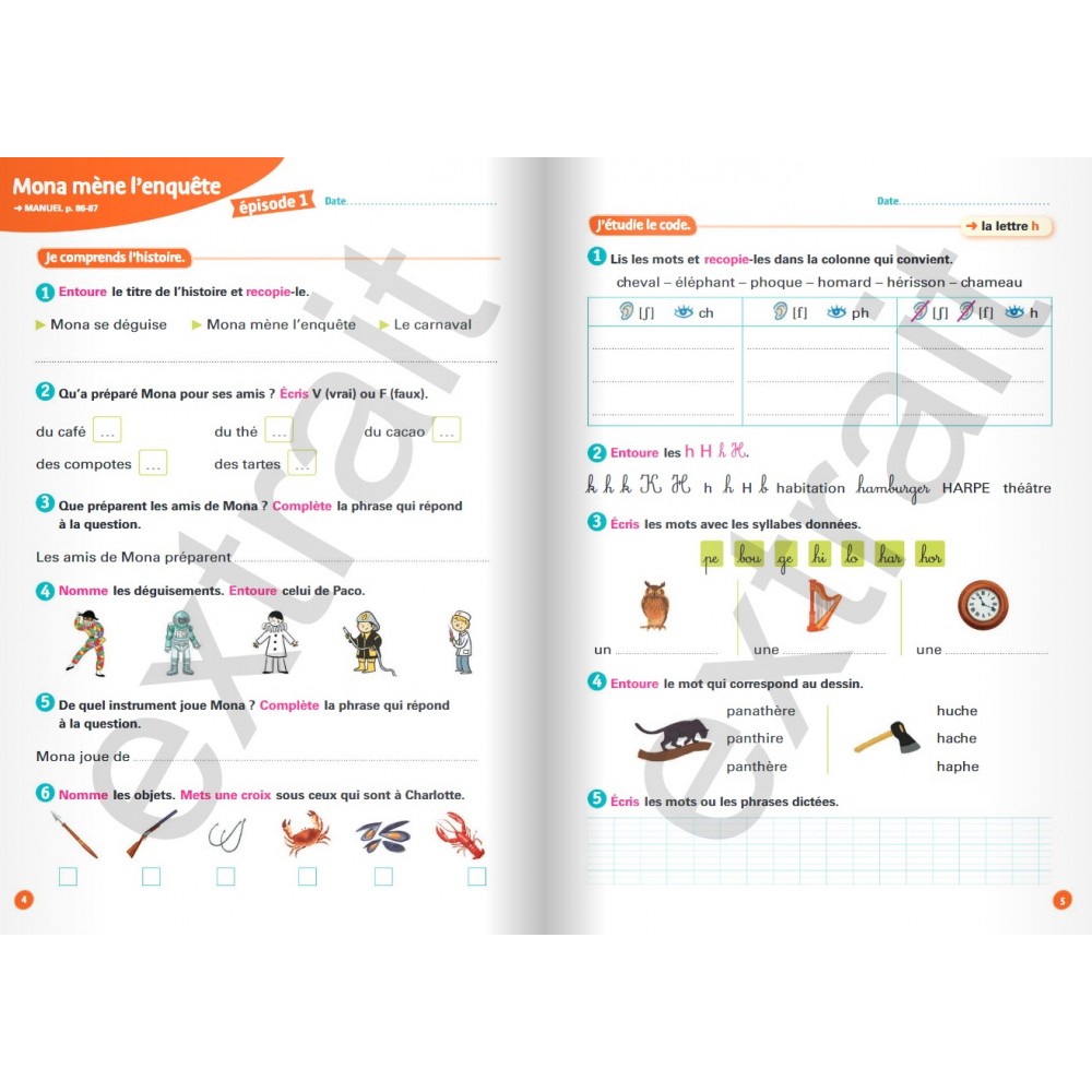 Le cahier d'exercices permet de réinvestir en autonomie les apprentissages de chaque leçon avec : Des activités de découverte des correspondances graphème/phonème (CGP), d’entraînement et de consolidation prégnantes, variées et systématiques. Des exercices de catégorisation du vocabulaire, de mise en évidence de morphèmes, d’apprentissage des mots outils les plus fréquents. Des exercices de manipulation syllabique (de la syllabe simple aux syllabes plus complexes), puis phonémique. Des activités d’encodage de syllabes, de mots et de phrases.