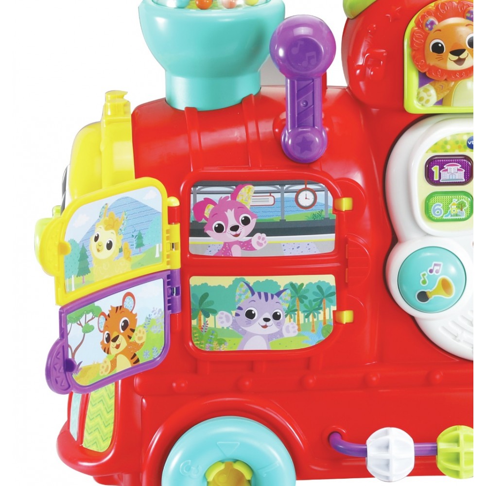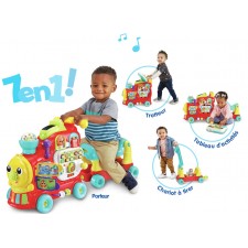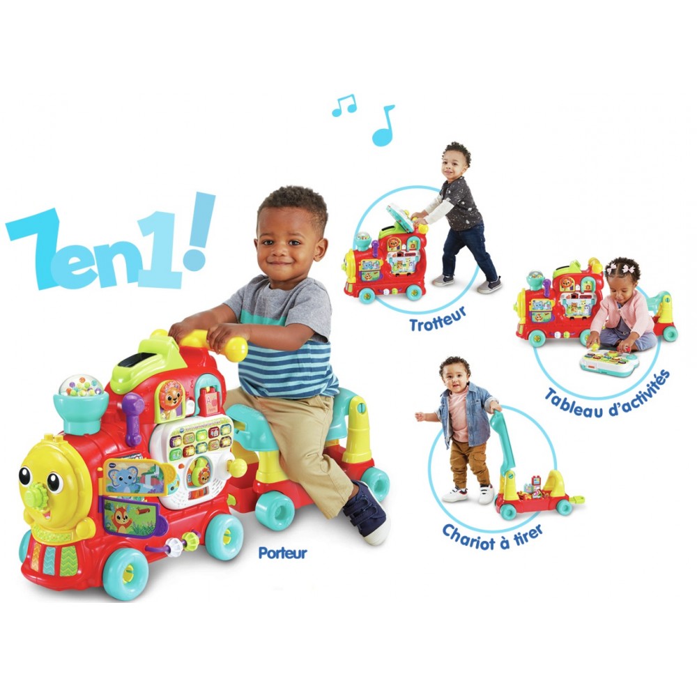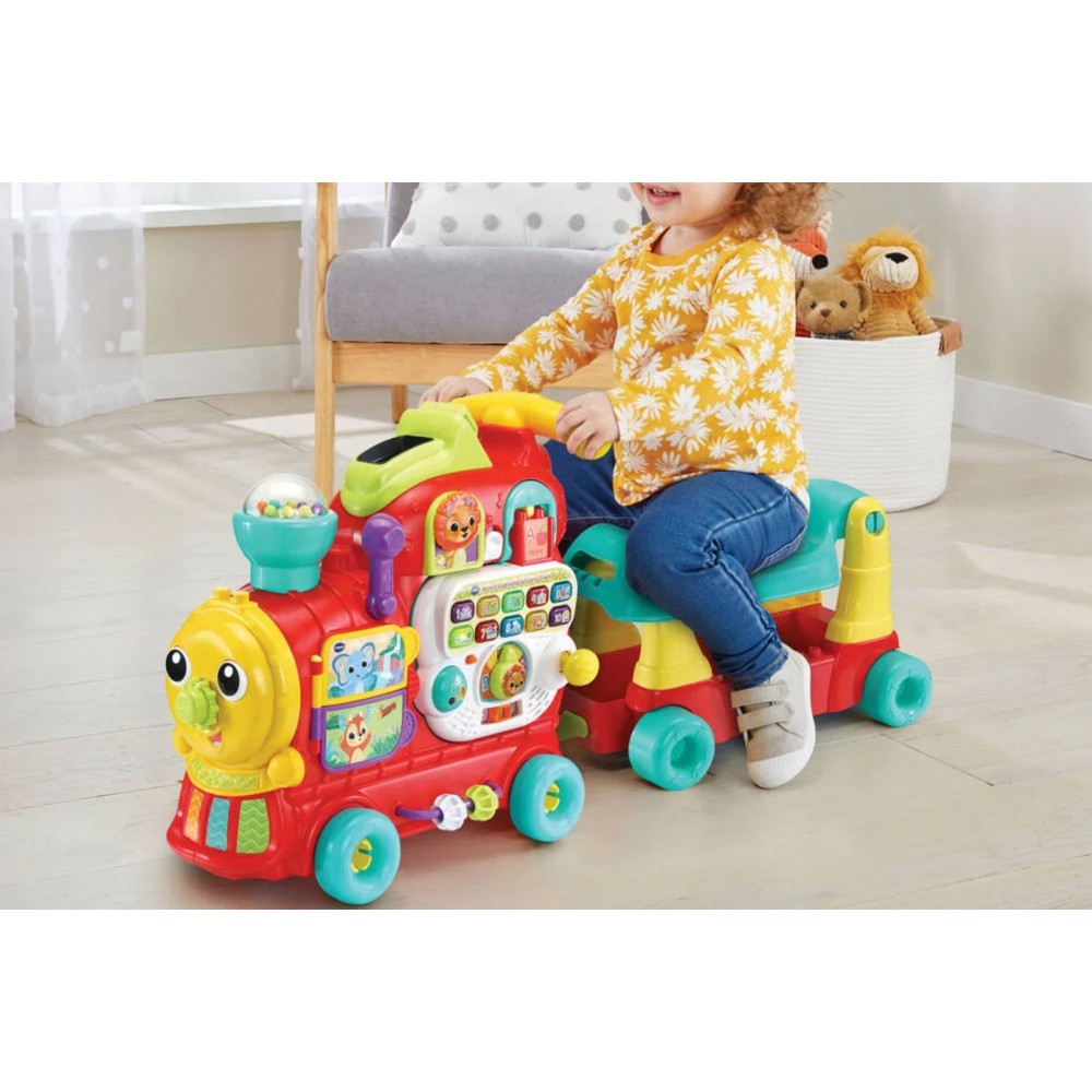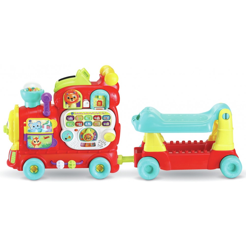 Un jouet 7 en 1 : jeu au sol, trotteur, tableau d'activités détachable, porteur, jeu de construction, toboggan et chariot à tirer - Assis sur sa maxiloco, bébé part à l’aventure - Le wagon est détachable pour permettre à Bébé de pousser la locomotive - Les 13 blocs recto-verso inclus sont reconnus par le jouet - Bébé apprend les lettres, leur son, les couleurs et du vocabulaire.