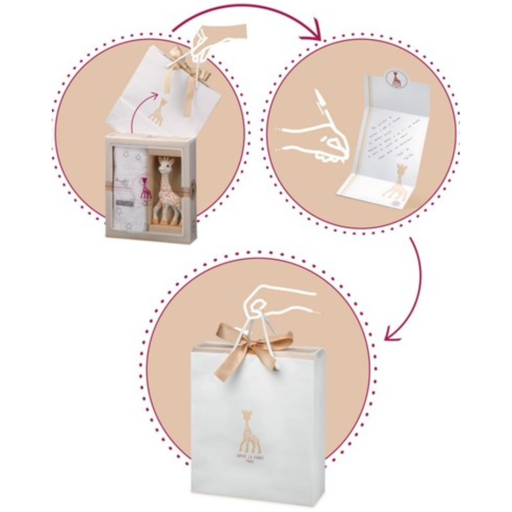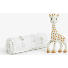 Coffret cadeau à l'effigie de Sophie la Girafe, contenant un lange, pour la naissance de bébé - Un coffret cadeau naissance original, dans un écrin tendre et raffiné - Comprend une Sophie la girafe + une grande lange.
