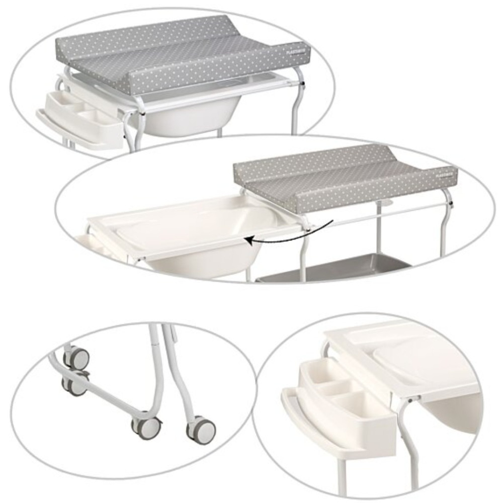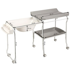 Chariot de bain 2en1, baignoire rigide coulissante et table à langer. Dès la naissance. Baignoire bébé rigide qui se range sous le matelas à langer. Le chariot dispose de 6 roues (stabilité) et de 4 freins pour bloquer les roues. Le matelas à langer est constitué d'une mousse confortable semi-rigide. 1 tuyau d'évacuation inclus pour vider l'eau du bain. 1 Porte serviette et multiples rangements inclus. Lavable à l'eau.