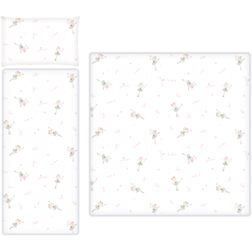 Set couverture à poser dans le couffin haut d’une poussette bébé - Idéal pour garder bébé au chaud pendant les balades - Constitué d'un oreiller, d'un coussin fin et d'une couverture tous disposant d'un revêtement en pur coton et d'un rembourrage en polyester premium - Présente un design féminin stylé avec des motifs de ballerines qui dansent et un coloris mixte rose et blanc.