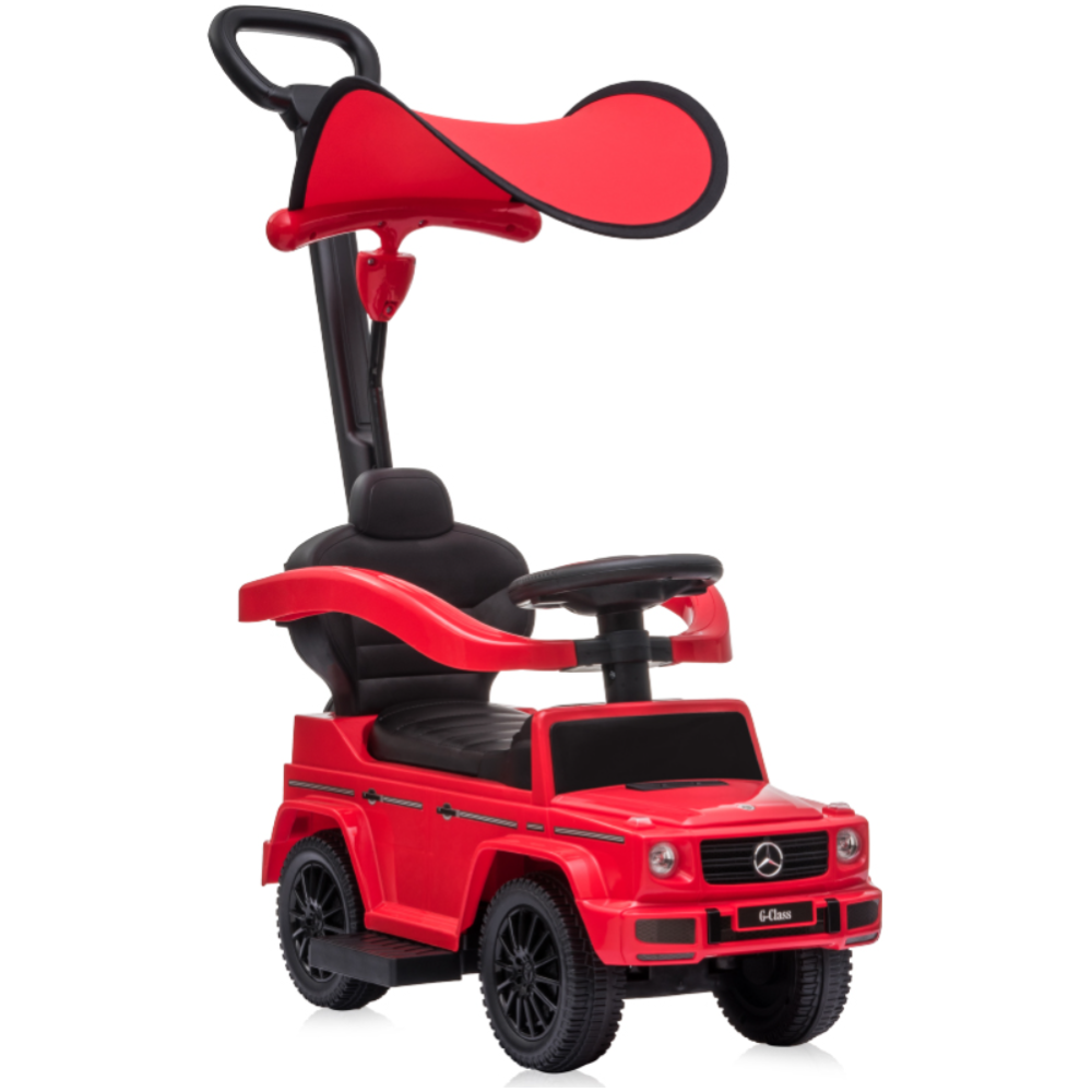 Voiture à pousser Mercedes G350D de couleur rouge dotée d’un pare-soleil démontable - Embarque un trépied devant chaque portière pour faciliter l’entrée du chauffeur dans le véhicule - Dotée d’une poignée de guidance pour le parent - Equipée de 4 grandes roues - Dispose d’un siège confortable avec dossier et d’un espace de rangement des jouets sous le siège - Conçue dans un design hyper réaliste.