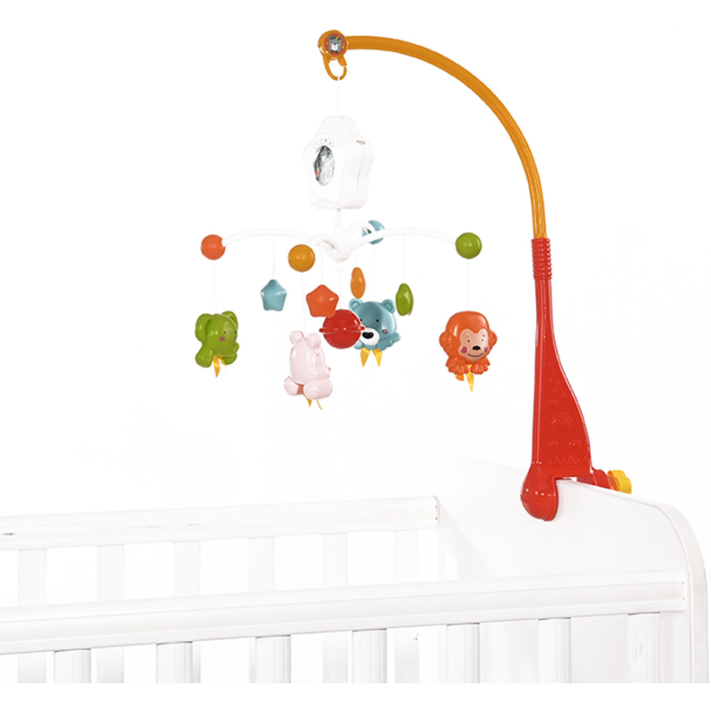 Mobile musical Happy animal très coloré, sert de carrousel musical pour bercer bébé pendant qu'il fait dodo - Est équipé d'un projecteur de ciel aux couleurs vives qui captive l'attention du tout-petit et crée une ambiance apaisante pour lui - Grâce aux mélodies incluse dans le mobile, bébé trouve facilement le sommeil - Cet appareil fonctionne avec des piles AAA et il émet une rotation à 360° qui aide aussi au développement de la motricité du bébé.