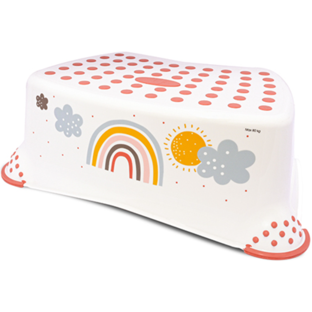 Escalier pour enfant idéal pour donner un peu de hauteur aux tout-petits et accéder au lavabo ou une étagère haute - Dispose d’une capacité de portage jusqu’à 80 kg - Arbore un motif d’arc-en-ciel attractif pour captiver l’attention des tout-petits - Constitué de patins larges assurant l’équilibre du support sur une surface place - Conçu avec une surface antidérapante en caoutchouc qui limite le risque de glissade - Mensurations de l’escalier : 40 cm de long, 28 cm de large et 14 cm de haut.