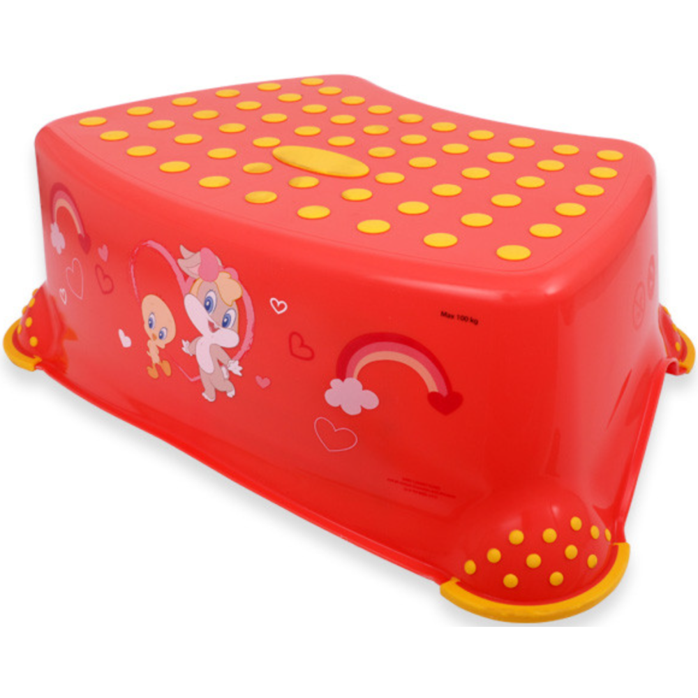 Rehausseur pour enfant conçu en forme de marche pour donner quelques centimètres de hauteur aux enfants en toute sécurité - Décoré avec des imprimés Looney Tunes -Doté d’une surface supérieure antidérapante qui limite le risque de glissage - Fabriqué avec une base antidérapante qui assure la stabilité de l’enfant en tout temps - Affiche un design minimaliste et ergonomique pour s’intégrer facilement à la maison - Fabriqué avec du plastique propylène comme composant principal et du caoutchouc synthétique au niveau du couvre-pied et de la marche - Dispose d’une capacité de portage de 80 kg - Dimensions du rehausseur : 40 cm de long, 26 cm de large et 14 cm de haut pour un poids de 500 grammes seulement - S’entretient aisément avec un chiffon doux trempé dans l’eau.