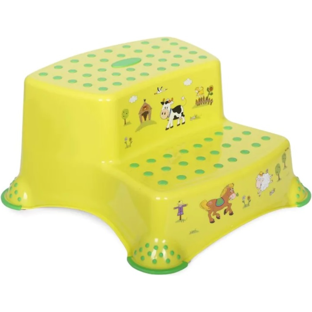 Escalier 2 marches motifs animaux de ferme et au coloris vert citron idéal pour aider nos enfants à brosser leurs dents et se laver les mains comme les grands - Permet d'accéder facilement au lavabo - Léger mais robuste - Peut supporter jusqu'à 100kg de charge - Dispose d'une bonne sécurité avec une surface antidérapante en plus d'être en caoutchouc - parties supérieure et pied en caoutchouc pour empêcher l'escalier de basculer ou déraper mais aussi pour assurer la stabilité et la sécurité de l'enfant.