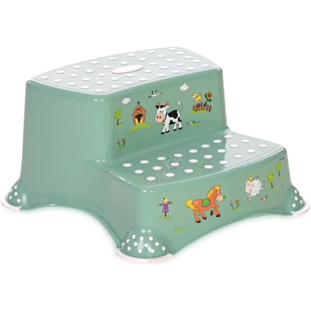 Escalier 2 marches aux motifs animaux de ferme pour enfants de 3 à 10 ans - Antidérapant - Montage et utilisation en toute sécurité - Idéal pour atteindre le lavabo ou les toilettes - Aucun risque de basculement ou de chute grâce au système antidérapant avec pieds en caoutchouc - Stabilité assurée par des picots en caoutchouc sur la surface supérieure - Conception robuste et durable - Facile à nettoyer et fabriqué en plastique - Capacité jusqu'à 100kg - Transport aisé - Coloris vert foncé.