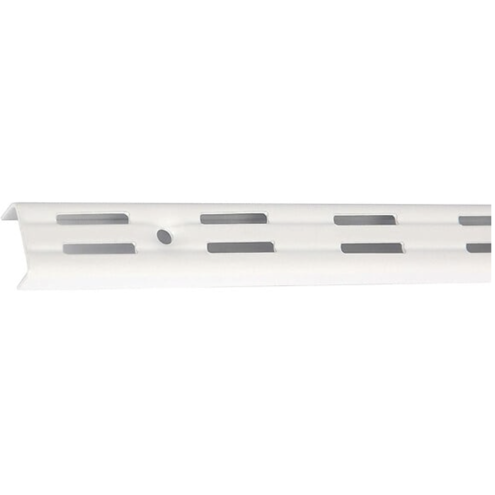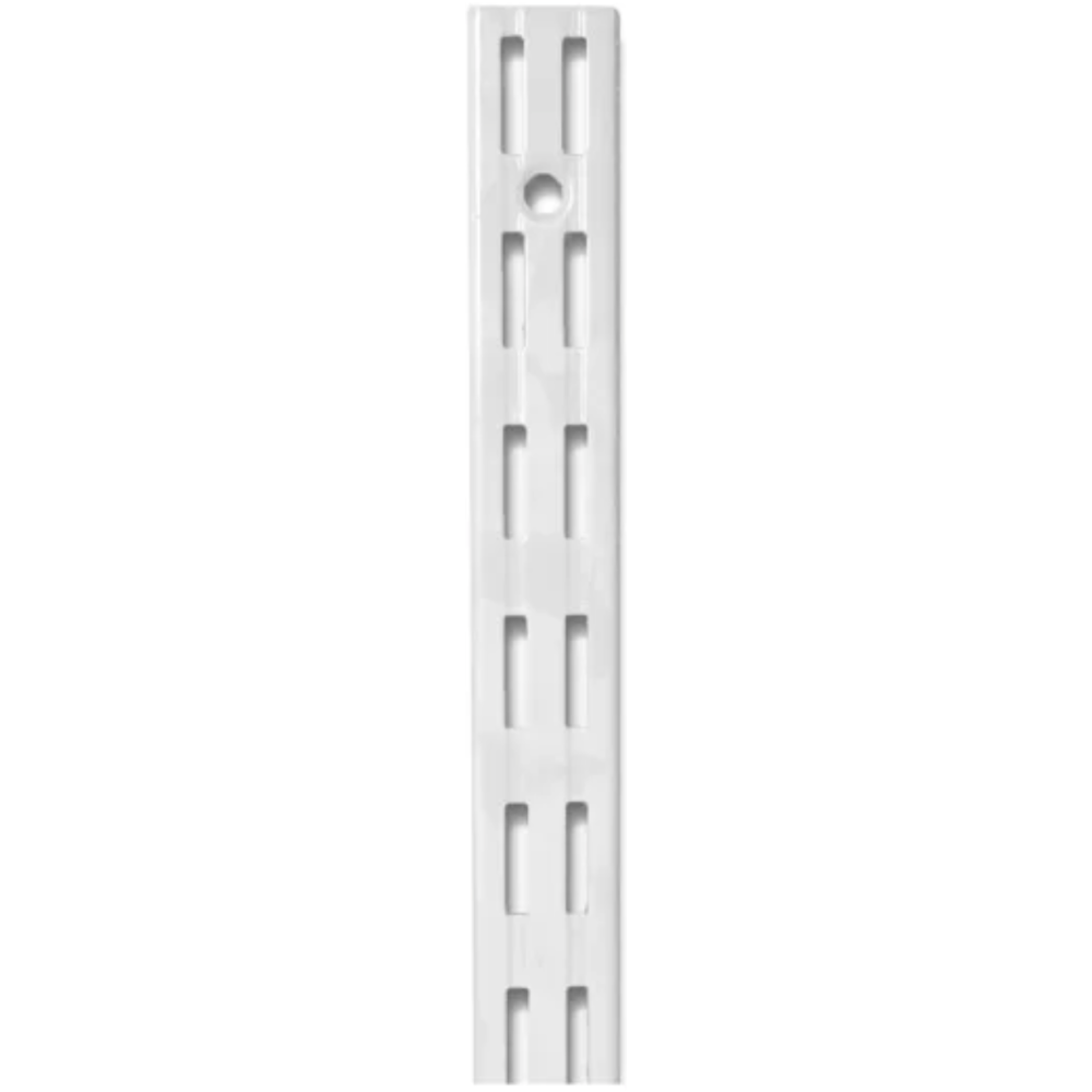 Crémaillère murale double en acier laqué - Marque : MONIN - Référence : 527380 - Finition blanche, résistante à l'usure et à la corrosion - Entraxe de 32 mm pour montage modulable - Longueur : 2290 mm - Double perforation pour ajuster taquets et étagères à différentes hauteurs - Idéale pour des rangements personnalisés (livres, outils, objets déco) - EAN : 4006676006922.