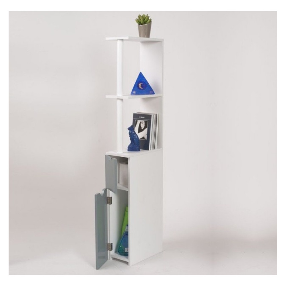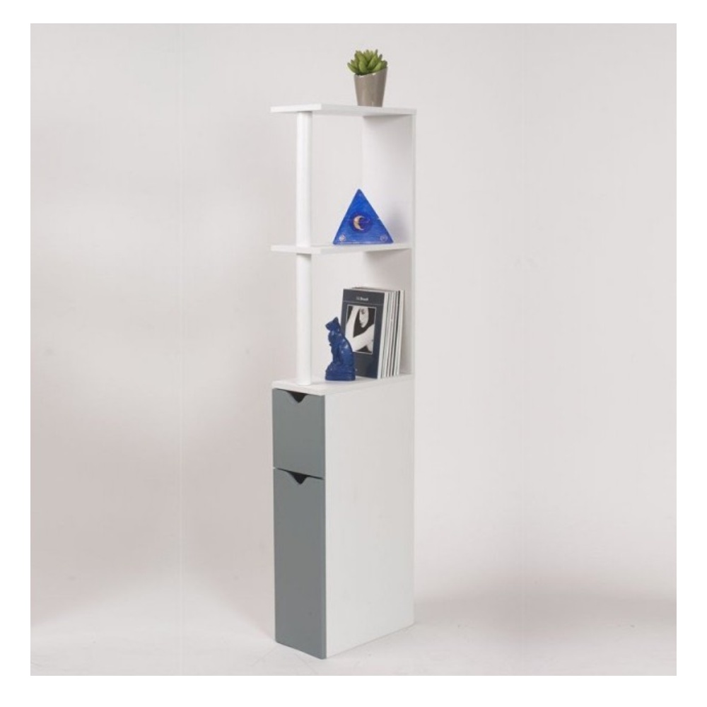 Ce meuble de rangement bois très compact et fonctionnel est idéal pour optimiser l'espace dans vos WC ou votre petite salle de bains. Ne perdez plus de place ! Facile à monter, ce meuble de toilettes offre un joli rendu ainsi que plein de rangements pour accueillir revues, rouleaux de papier toilette, produits d'entretien ou encore diffuseurs de parfum. Le meuble wc blanc et gris est composé de 2 placards bas et de 3 étagères, le tout dans un style épuré très décoratif. Cet astucieux meuble gain de place en bois mélaminé est facile à nettoyer et trouvera parfaitement sa place dans un angle à côté du lavabo, de la cuvette des toilettes, ou même dans une chambre pour un petit coin bibliothèque ! Matière : plaque de particule en bois mélaminé blanc 12 mm et papier mdf 3 mm d'épaisseur - Meuble gain de place en bois - Dimensions totales du meuble : Largeur : 15,2 cm - Profondeur : 29,8 cm - Hauteur 118 cm - Dimensions de la partie inférieure du meuble: hauteur placard inférieur : 40 cm - hauteur placard supérieur: 19 cm - Coloris des portes : blanc et gris. 2 portes à l'avant + 3 niveaux (avec 2 étagères).