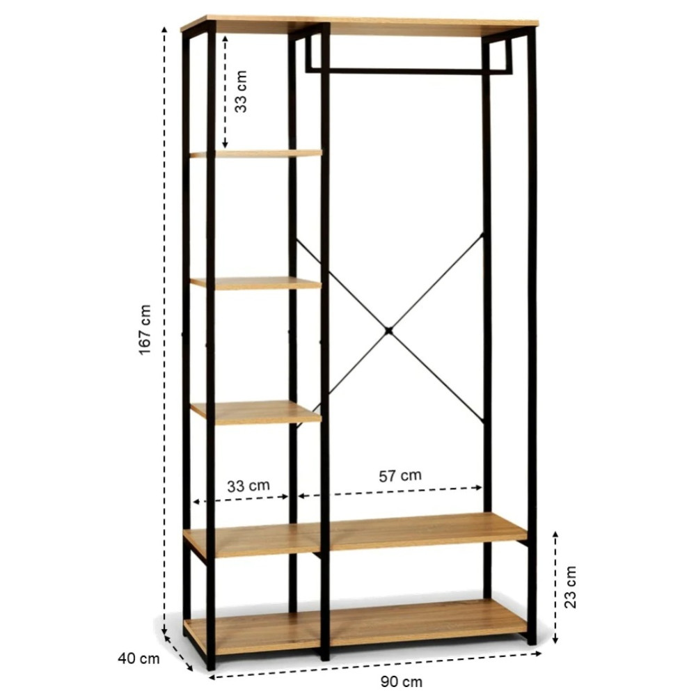 Détails dimensions : - Partie penderie : l. 57 x H. 132 cm. - Étagère : l. 33 H. 33 cm. - Hauteur de chaque étage : H. 29.5 - 64 - 98 - 132.5 cm. Croisillons à l'arrière pour renforcer la structure.