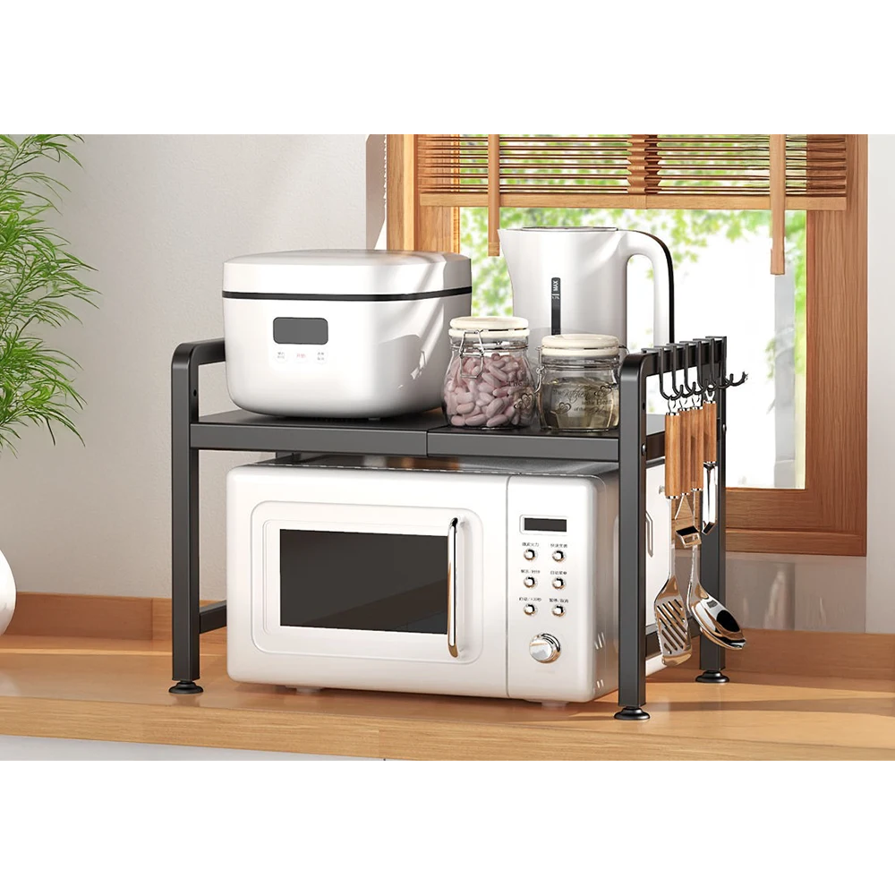 Ce support de rangement extensible en métal noir est idéal pour organiser votre espace cuisine avec efficacité. Robuste et stable, il permet d’accueillir un micro-ondes ou d’autres appareils électroménagers tout en offrant une étagère supérieure pour vos accessoires. Sa longueur réglable de 40 à 64 cm s’adapte facilement à différents espaces. Pratique, il est équipé de crochets latéraux pour suspendre ustensiles et accessoires, facilitant ainsi votre quotidien. Son design moderne et fonctionnel s’intègre parfaitement dans toutes les cuisines. Dimensions : 40-64 x 36,5 x 46 cm.