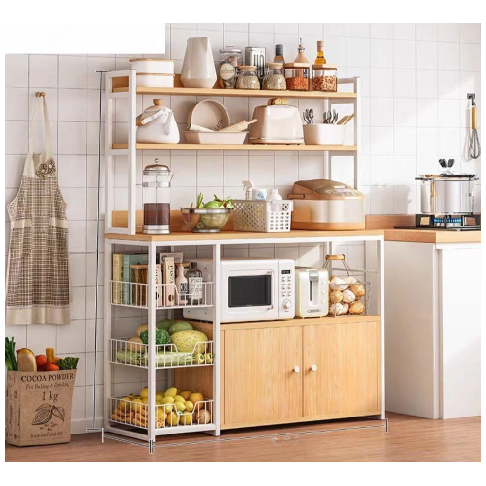 Le meuble de rangement cuisine avec surmeuble YA-05 allie design moderne et grande fonctionnalité pour optimiser votre espace. Sa structure en métal blanc assure robustesse et stabilité, tandis que ses plateaux en bois MDF effet chêne apportent une touche chaleureuse et élégante. Doté de plusieurs niveaux de rangement, de paniers pratiques et d’un espace fermé, il permet d’organiser facilement vaisselle, aliments et petits appareils. Idéal pour les cuisines compactes, il offre une capacité de stockage maximale tout en restant esthétique. Dimensions : 120 x 30 x H 146 cm.