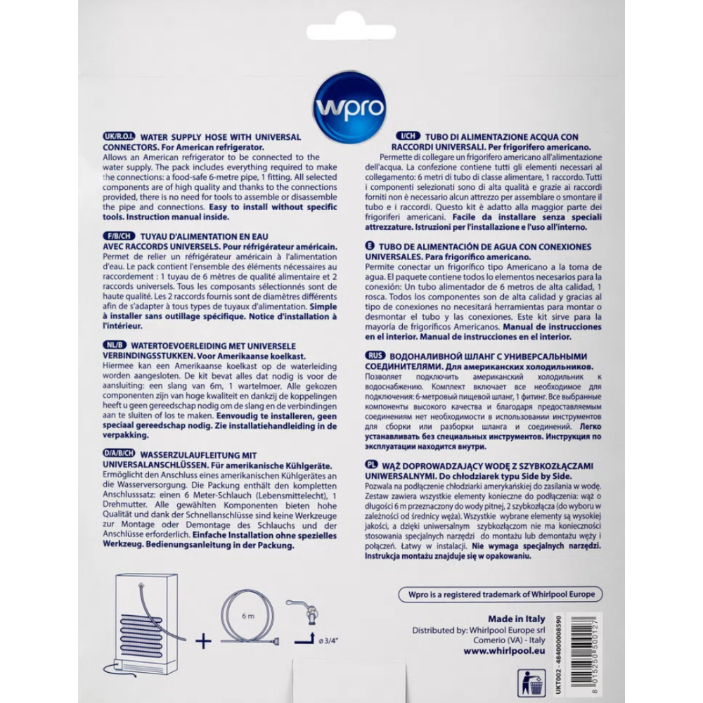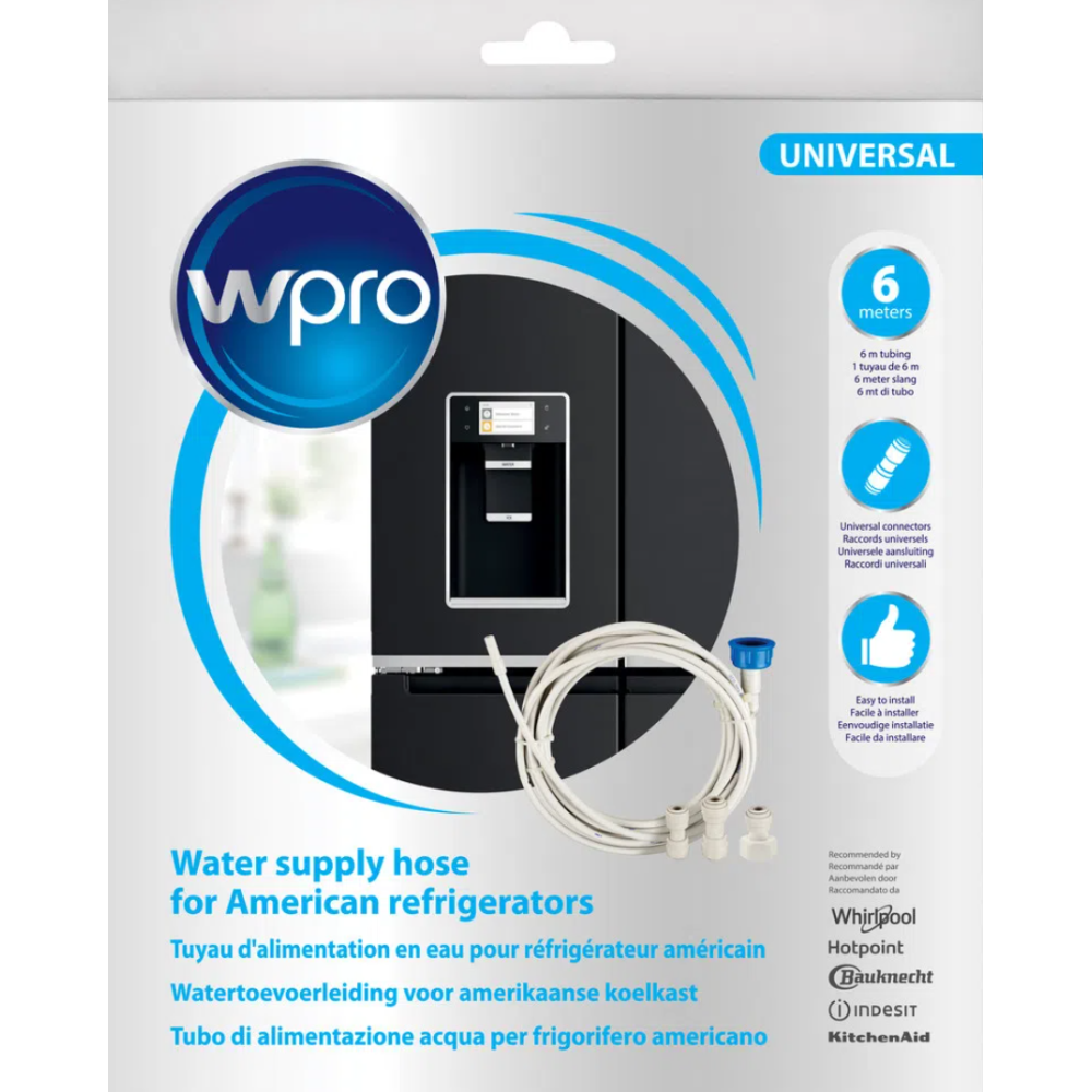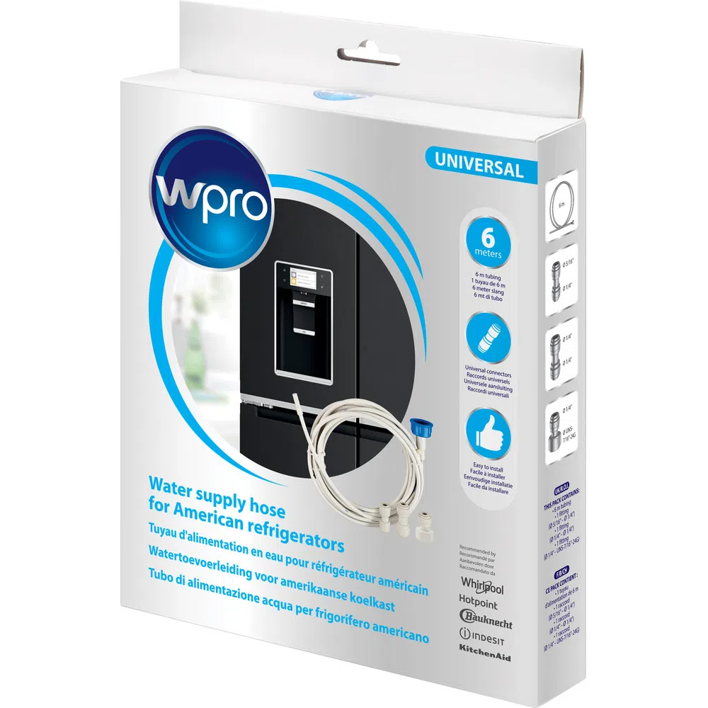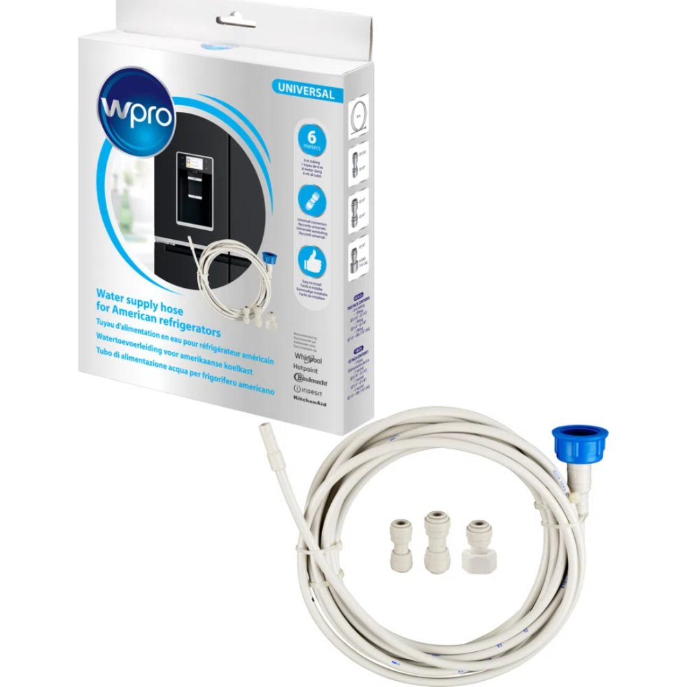 Tuyau d'alimentation en eau Wpro de Whirlpool pour conduite d'eau dans un réfrigérateur américain - Indispensable pour profiter du distributeur d'eau et de glace de votre réfrigérateur - Facile à installer et sans besoin d'outils - Fait 6 m de long avec raccords universels - Permet de relier le réfrigérateur à l'alimentation d'eau - Contient l'ensemble des éléments nécessaires au raccordement - Convient à toutes marques de réfrigérateurs - Diamètre intérieur 4,2 mm, diamètre extérieur 6,2 mm, raccords 3/4" et accouplement 1/4" - coloris blanc.