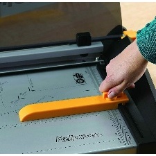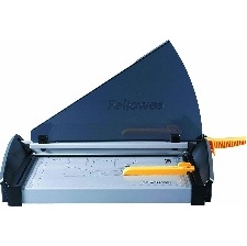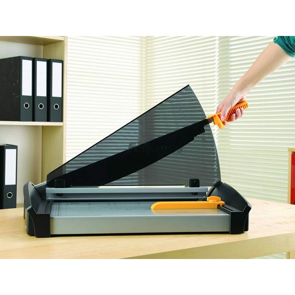 Fellowes rogneuse Gamma, format A3, capacité: 20 feuilles, longueur de coupe: 455 mm, dimensions de la plaque de coupe en métal:(L)455 x (P)225 mm, butée réglable, serre-papier, avec poignée de transport,, couleur: noir/jaune.