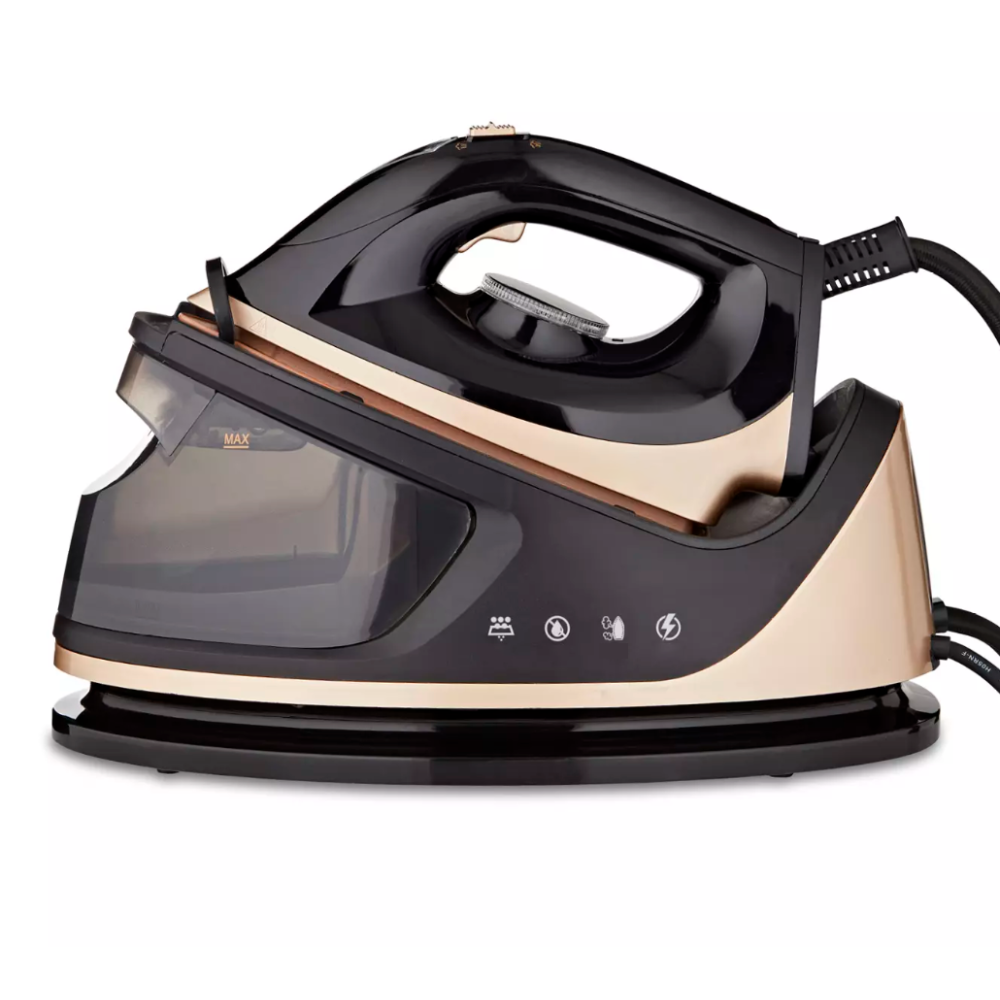Centrale vapeur - 7LINE DF-199 - Couleur principale : Noir avec des touches dorées - Dimensions compactes : 36,2 × 18,5 × 26,3 cm - Performance : Puissance : 2200-2400 W - Pression vapeur : Moins de 4 bars (équivalent à 3,5 bars) - Débit vapeur continu puissant avec option vapeur verticale - Fonction de repassage à sec - Réservoir et Usage : Capacité du réservoir d’eau : 1,2 L - Rechargeable en cours d'utilisation - Fonctions avancées : Plaque de revêtement : En céramique - Systèmes anti-calcaire et anti-goutte pour un entretien facile - Stockage pratique du cordon - Ergonomie : Poids net : 2,4 kg (Poids brut : 3,1 kg) - Nomade et facilement transportable - Compatibilité électrique : Tension/Fréquence : 220-240 V, 50 Hz.