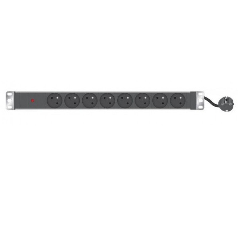 Bandeau multiprise rackable 19'' avec voyant - 8 prises françaises type CEE7 femelle - Boitier aluminium - Câble H05VV-F 3x1.5 mm2 avec fiche française type CEE7 male - Longueur du câble : 2.35 m - Equerres de fixation 19'' orientables - Voyant de mise sous tension - Puissance maximum : 16 A - Indice IP : IP20