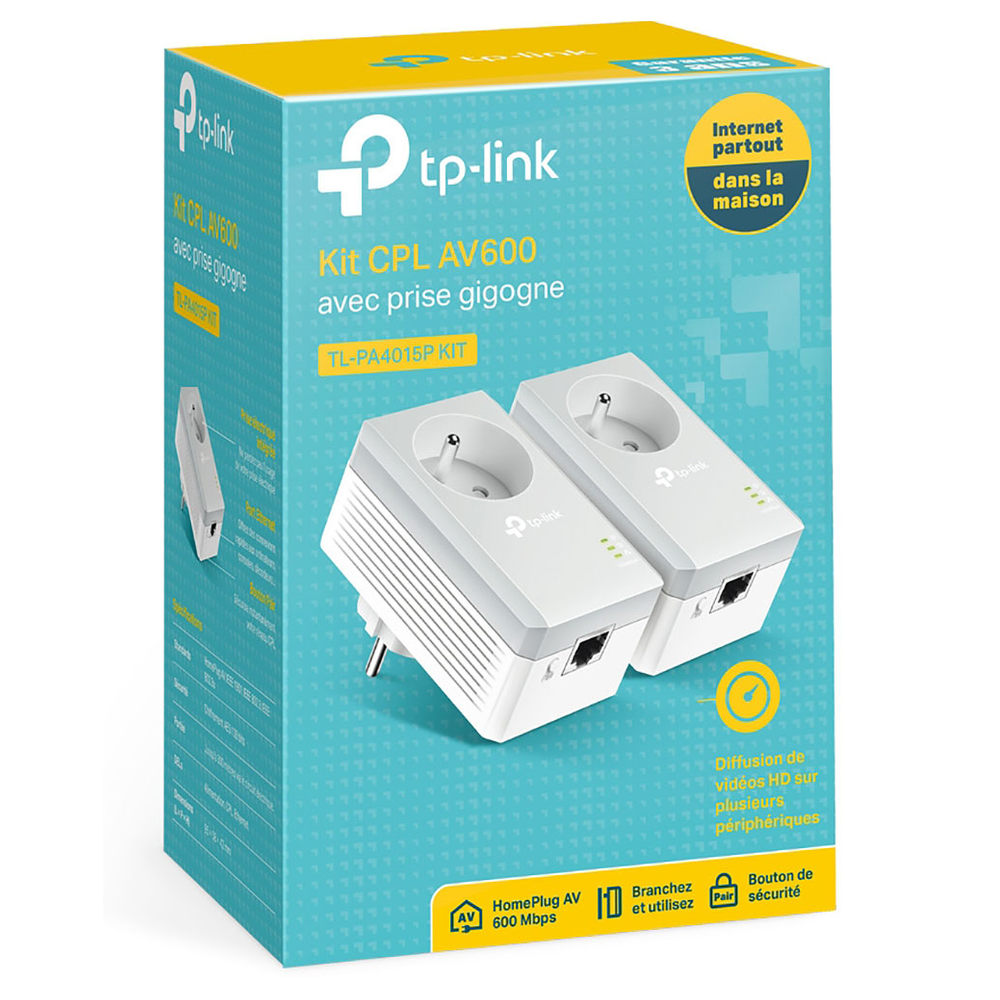 Le pack CPL TP-LINK TL-PA4015PKIT transforme votre circuit électrique en un réseau haut débit sans avoir à tirer de nouveaux câbles ou à percer des trous. Aucune configuration n'est requise, branchez simplement vos adaptateurs dans une prise électrique et créez un réseau CPL en un éclair ! - Compatible avec le standard HomePlug AV, transferts de données haut débit jusqu'à 600 Mb/s : idéal pour les vidéos HD et les jeux en ligne - Prise électrique intégrée permettant à d'autres appareils d'accéder à une source électrique - Filtre les fréquences parasites pour des performances CPL optimales - Portée des signaux jusqu'à 300 m via le réseau électrique, pour les meilleures performances à travers murs et planchers - Plug & Play : pas de nouveaux câbles ni de configuration nécessaire...