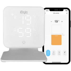Thermostat Wi-Fi Climpac recommandé pour faire des économies en contrôlant à distance les climatiseurs et pompes à chaleur disposant d’une télécommande infrarouge - Inclut un thermomètre et un hygromètre intégrés pour gérer à distance et avec précision la température et le taux d’humidité avec les sondes intégrées dans le thermostat - Fourni avec une télécommande infrarouge universelle permettant de piloter d’autres appareils tels que des TV, box Internet, déshumidificateurs, etc - Poids du thermostat : 240 grammes - Fonctionne avec des assistants vocaux comme Siri et Google - Dispose d’un affichage LED haute visibilité qui permet une lecture aisée des données.